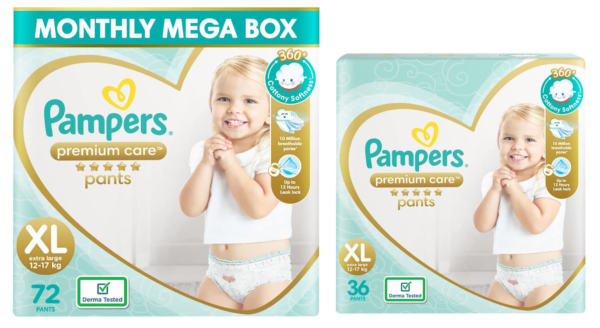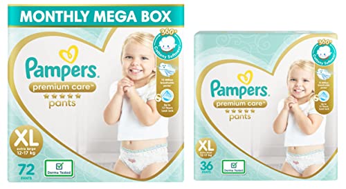 Pampers Premium Care Pants Diapers Monthly Box Pack X-Large 72 CountNew pampers premium pants with cotton like soft materials is best for your baby delicate skin. Pampers premium pants contain lotion with aloe vera and 3 air channels which helps your baby skin breathe. Experience 5 star comfort with unique added features like wetness indicator which turns yellow to blue indication when you may change and disposal tape which helps you in easy disposal of the diaper. Pampers is the no. 1 Choice of doctors for diapers. Pampers premium pants are available in new-born (nb) s m l xl and xxl sizes.Pampers Premium Care Pants Diapers X-Large 36 CountNew Pampers Premium Pants with cotton like soft materials is best for your baby delicate skin. Pampers Premium Pants contain lotion with Aloe Vera and 3 Air Channels which helps your baby skin breathe. Experience 5 Star comfort with unique added features like Wetness Indicator which turns Yellow to Blue indication when you may change and Disposal Tape which helps you in easy disposal of the diaper. Pampers Premium Pants are available in New-born (NB) S M L XL and XXL sizes.