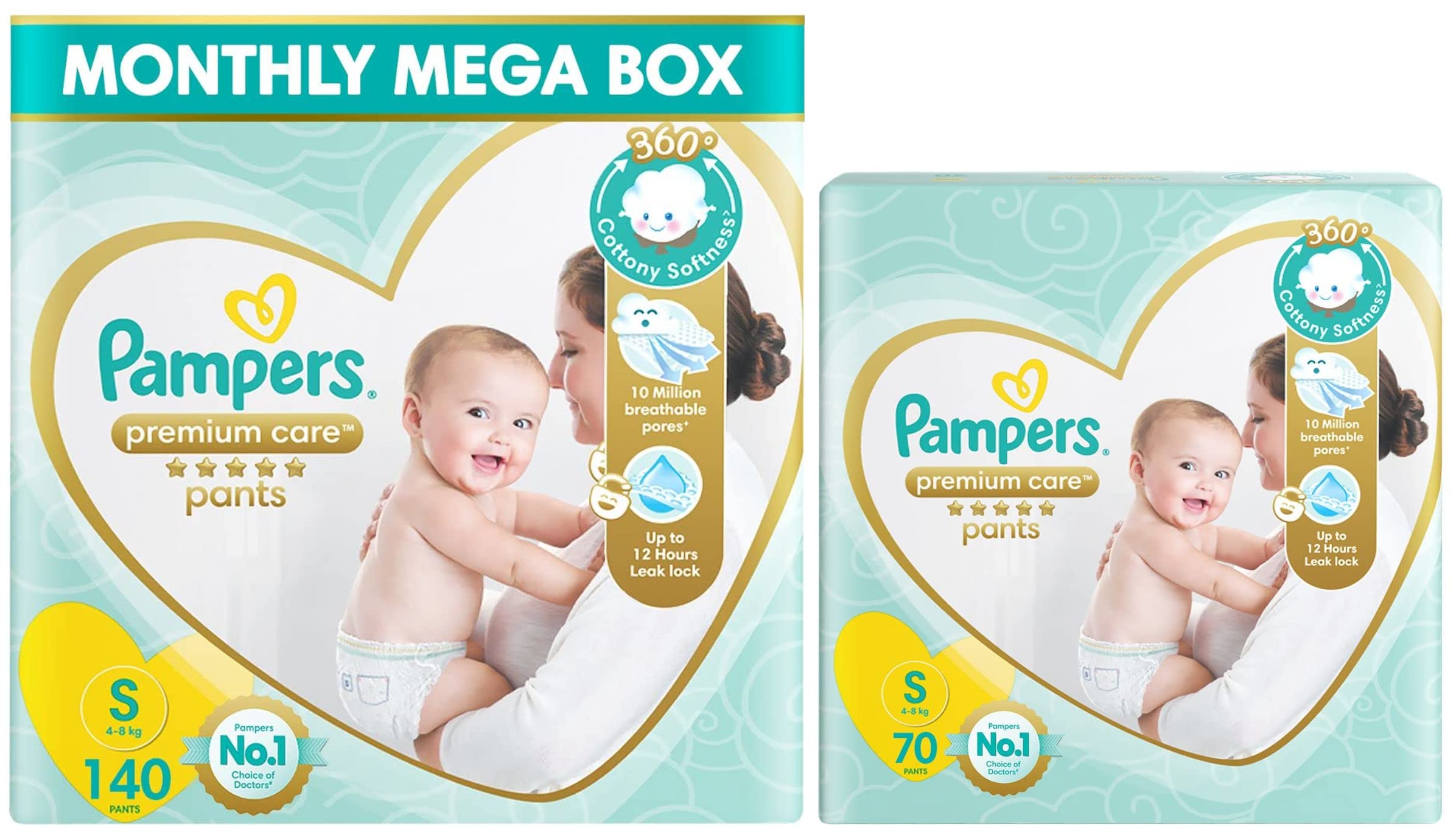 Pampers Premium Care Pants Diapers Small 70 CountNew Pampers premium pants with cotton like soft materials is best for your baby’s delicate skin. Pampers premium pants contain lotion with aloe vera and 3 air channels which helps your baby’s skin breathe. Experience 5 star comfort with unique added features like wetness indicator which turns yellow to blue indication when you may change and disposal tape which helps you in easy disposal of the diaper. Pampers is the no.1 choice of doctors for diapers. Pampers premium pants are available in new born (nb) s m l xl and xxl sizes.Pampers Premium Care Pants Diapers Small 140 CountNew Pampers premium pants with cotton like soft materials is best for your baby’s delicate skin. Pampers premium pants contain lotion with aloe vera and 3 air channels which helps your baby’s skin breathe. Experience 5 star comfort with unique added features like wetness indicator which turns yellow to blue indication when you may change and disposal tape which helps you in easy disposal of the diaper. Pampers is the no. 1 Choice of doctors for diapers. Pampers premium pants are available in new-born (NB) S M L XL and XXL sizes