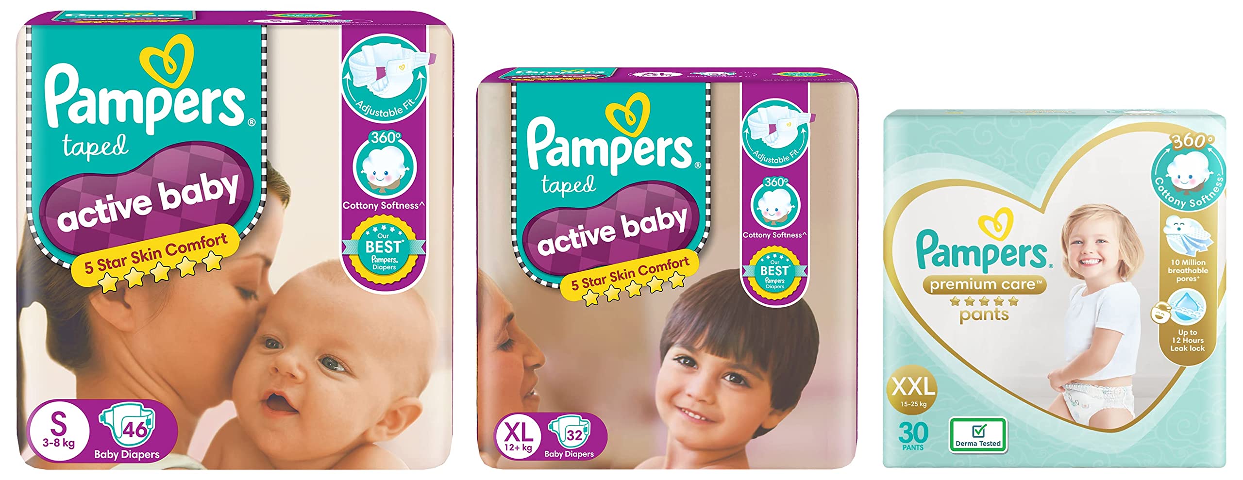 Pampers Premium Care Pants Double Extra Large Size Baby Diapers (XXL) & Active Baby Taped Diapers Small Size Diapers (SM) 46 Count Taped Style Custom fit & Active Baby Taped Diapers