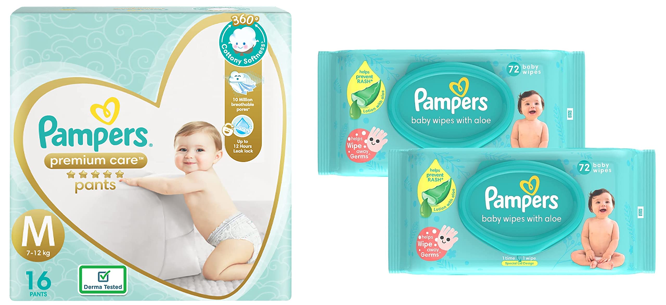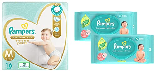 Pampers Premium Care Pants Medium size baby diapers (MD) 16 Count Softest ever Pampers pantsNew Pampers Premium Pants with cotton like soft materials is best for your baby delicate skin. Pampers Premium Pants contain lotion with Aloe Vera and 3 Air Channels which helps your baby skin breathe. Experience 5 Star comfort with unique added features like Wetness Indicator which turns Yellow to Blue indication when you may change and Disposal Tape which helps you in easy disposal. Pampers Premium Pants are available in New-born (NB) S M L XL and XXL sizes.Pampers Baby Gentle Wet Wipes with Aloe Vera 144 WipesEvery little miracle deserves gentle protection mothers & doctors have always trusted Pampers to provide the care. Presenting Pampers Baby Wipes with Aloe which have the goodness of lotion with Aloe vera to protect against skin rashes & redness. Containing 97% pure water Pampers Wipes provide mild cleaning for baby supples skin just like cotton & water. Pampers wipes are safe as they are paraben-free and infused with Vitamin-E. They help restore the natural pH of your baby skin keeping it healthy and nourished. Pampers wipes are thick soft and strong ensuring a perfect gentle cleaning for the baby skin. Lastly the wipes come with a refreshing mild fragrance that you and your baby will surely love. Wet wipes tissues with lid 72 pcs combo pack.