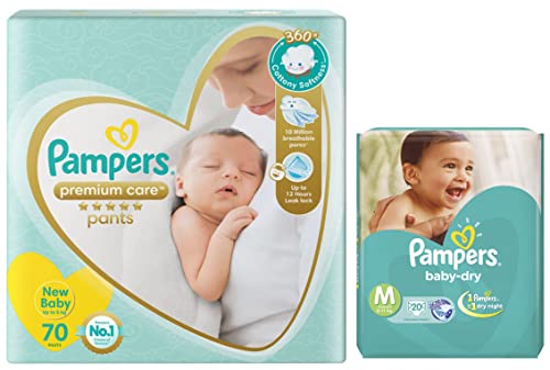 Pampers Premium Care Pants New Born Extra Small size baby Diapers (NB/XS) 70 count Softest ever PampersNew Pampers Premium Care Pants with 360 degree cottony softness gives your baby the ultimate comfort all day all night long. Pampers Premium Care Pants contain soothing lotion with Aloe Vera to protect your baby’s skin from rashes while its 10 million micropores allow your baby’s skin to breathe. Its 12-hour leak lock facility keeps your baby dry and away from wetness. Experience 5-Star comfort with unique added features like Wetness Indicator which turns Yellow to Blue indicating when you may change the diaper and a Disposal Tape to help you with easy disposal. Pampers Premium Pants are available in New-born (NB) S M L XL and XXL sizes.Pampers Taped Diapers Medium (MD) 20 countNEW & IMPROVED Pampers all-round protection pants have ANTI-RASH BLANKET* containing Lotion with Aloe Vera to keep your baby’s skin protected from redness irritation and rashes. quality diapers with 100% WETNESS LOCK keeps the pee locked inside & baby's bum stays dry for ALL NIGHT. Air channels & stretchy belt provides your baby breathable airy fit - comfortable even in summers. Pampers unique Magic gel technology provides up to 12 hours of dryness – and has 2X faster absorption. The new and improved product design enables a comfortable fit closer to the baby’s body and an EXTRA SOFT flexible waist band that adapts to baby’s movements for best comfort. Available in all sizes – Small diapers medium diaper pants large size diaper pants XL diapers XXL diapers XXXL diaper pants. A top layer with cotton-like soft material ensure a comfortable night’s sleep. Our pants with fun exterior graphics fun designs of characters and a delightful fresh Aloe fragrance ensures you enjoy every change with your baby. (*Blanket refers to soft topsheet with lotion. Helps prevent rash due to wetness after 1 day of usage based on clinical studies in USA 2000-2019).
