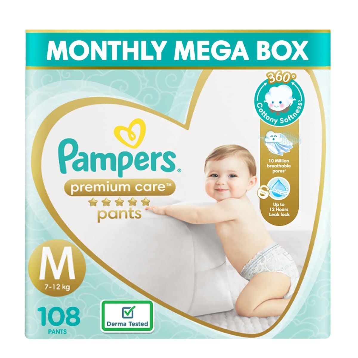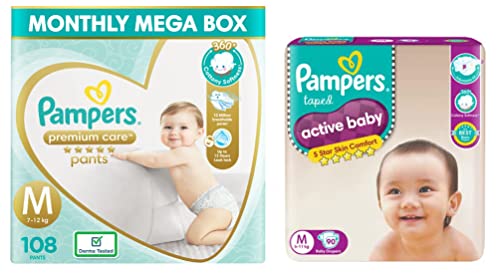 Pampers Premium Care Pants Small size baby Diapers (S) 70 Count Softest ever Pampers PantsNew Pampers Premium Care Pants with 360 degree cottony softness gives your baby the ultimate comfort all day all night long. Pampers Premium Care Pants contain soothing lotion with Aloe Vera to protect your baby’s skin from rashes while its 10 million micropores allow your baby’s skin to breathe. Its 12-hour leak lock facility keeps your baby dry and away from wetness. Experience 5-Star comfort with unique added features like Wetness Indicator which turns Yellow to Blue indicating when you may change the diaper and a Disposal Tape to help you with easy disposal. Pampers Premium Pants are available in New-born (NB) S M L XL and XXL sizes.Pampers Active Baby Taped Diapers Small size diapers (SM) 46 count taped style custom fit5 Star Skin Protection: The Best tape style diapers from Pampers with an outer layer of cotton-like softness this baby diaper provides intense care to your baby's sensitive skin and protects it effectively from friction rash and redness. These soft and comfort fitting diapers with stretchable sides are best for your baby's rest and playtime. The diaper's fastening tape sticks multiple times thus ensuring it stays in place even after you fasten it after checking your baby's diaper. Protection and nourishment of your baby's skin are taken care of with extracts of moisturizing Aloe Vera lotion characteristic of these best baby diapers.. These diapers are ultra-thin thanks to the absorbent gel material (AGM) commonly known as Magic Gel. This magic gel core of Pampers diapers is highly effective in absorbing frequent wetness. Naturally your baby's skin remains dry for upto 12 hours now no more frequent diaper changing or blow leaks for your little angel. Keep your baby's skin delicate with 5 star skin protection. Pampers Active Baby comes with 5 features in just one diaper. 12 hours dryness baby lotion cottony softness breathable cover and comfortable fit. 12 Hours Dryness Our driest diaper keeps baby's skin touchably dry for up to 12 hours. Baby Lotion This unique diaper is infused with baby lotion to help prevent diaper rash. Cottony Softness Keep baby's skin free from irritation with cotton-like softness. Breathable Cover Air circulates so baby's skin can breathe easily and stay wonderfully fresh. Comfortable Fit A flexible side stretch design keeps it snug and comfy whether baby is at rest or play. Diaper Sizer Five Features in One Diaper View Larger Comparison Chart View Larger Using Pampers Pants When to Change Right before or right after every feeding After every bowel movement Before bedtime When your baby wakes up When you go out with your baby How to Change Put the diaper under the baby's body. Pull the elastic side properly. Apply both sides in symmetrical position on landing zone. Adjust the cuff around legs on both sides.