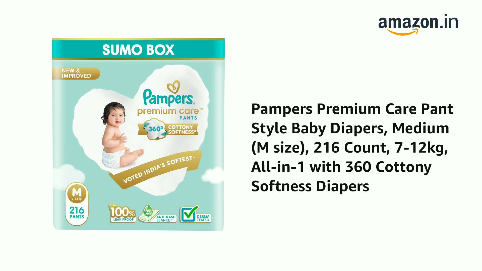 Pampers Premium Care Pant Style Baby Diapers, Medium (M size), 216 Count, 7-12kg, All-in-1 with 360 Cottony Softness Diapers