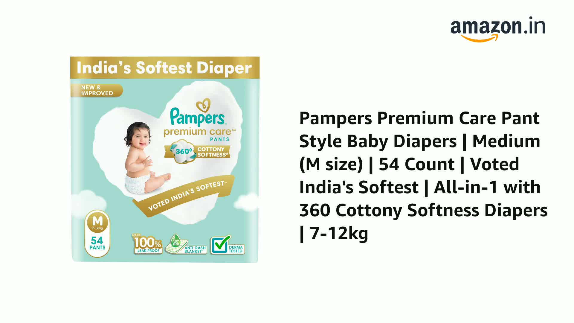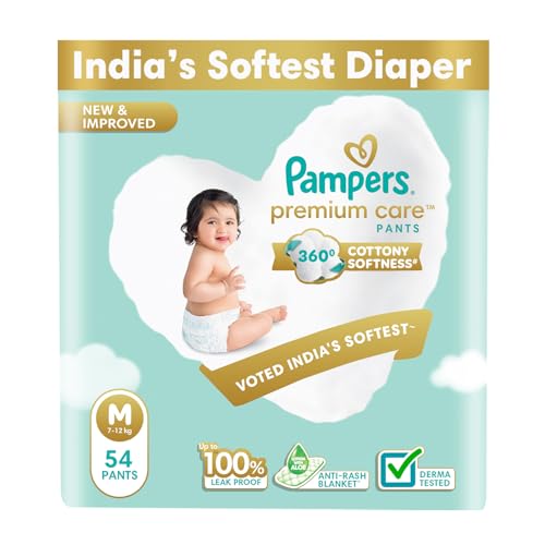 New Pampers Premium Care Pants with 360 degree cottony softness gives your baby the ultimate comfort all day all night long. Pampers Premium Care Pants contain soothing lotion with Aloe Vera to protect your baby skin from rashes while its 10 million micropores allow your baby skin to breathe. Its 12-hour leak lock facility keeps your baby dry and away from wetness. Experience 5-Star comfort with unique added features like Wetness Indicator which turns Yellow to Blue indicating when you may change the diaper and a Disposal Tape to help you with easy disposal. Pampers Premium Pants are available in New-born (NB) S M L XL and XXL sizes.