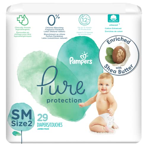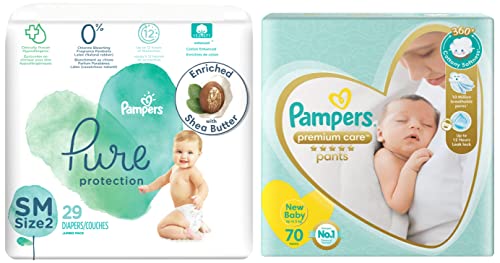 Pampers Pure Protection Baby Diapers Small Size Taped Diapers (SM) 29 Count [Hypoallergenic and unscented protection 0% chlorine paraben latex]Pampers Pure Protection Baby DiapersPampers Premium Care Pants New Born Extra Small size baby Diapers (NB/XS) 70 count Softest ever PampersNew Pampers Premium Care Pants with 360 degree cottony softness gives your baby the ultimate comfort all day all night long. Pampers Premium Care Pants contain soothing lotion with Aloe Vera to protect your baby skin from rashes while its 10 million micropores allow your baby skin to breathe. Its 12-hour leak lock facility keeps your baby dry and away from wetness. Experience 5-Star comfort with unique added features like Wetness Indicator which turns Yellow to Blue indicating when you may change the diaper and a Disposal Tape to help you with easy disposal. Pampers Premium Pants are available in New-born (NB) S M L XL and XXL sizes.