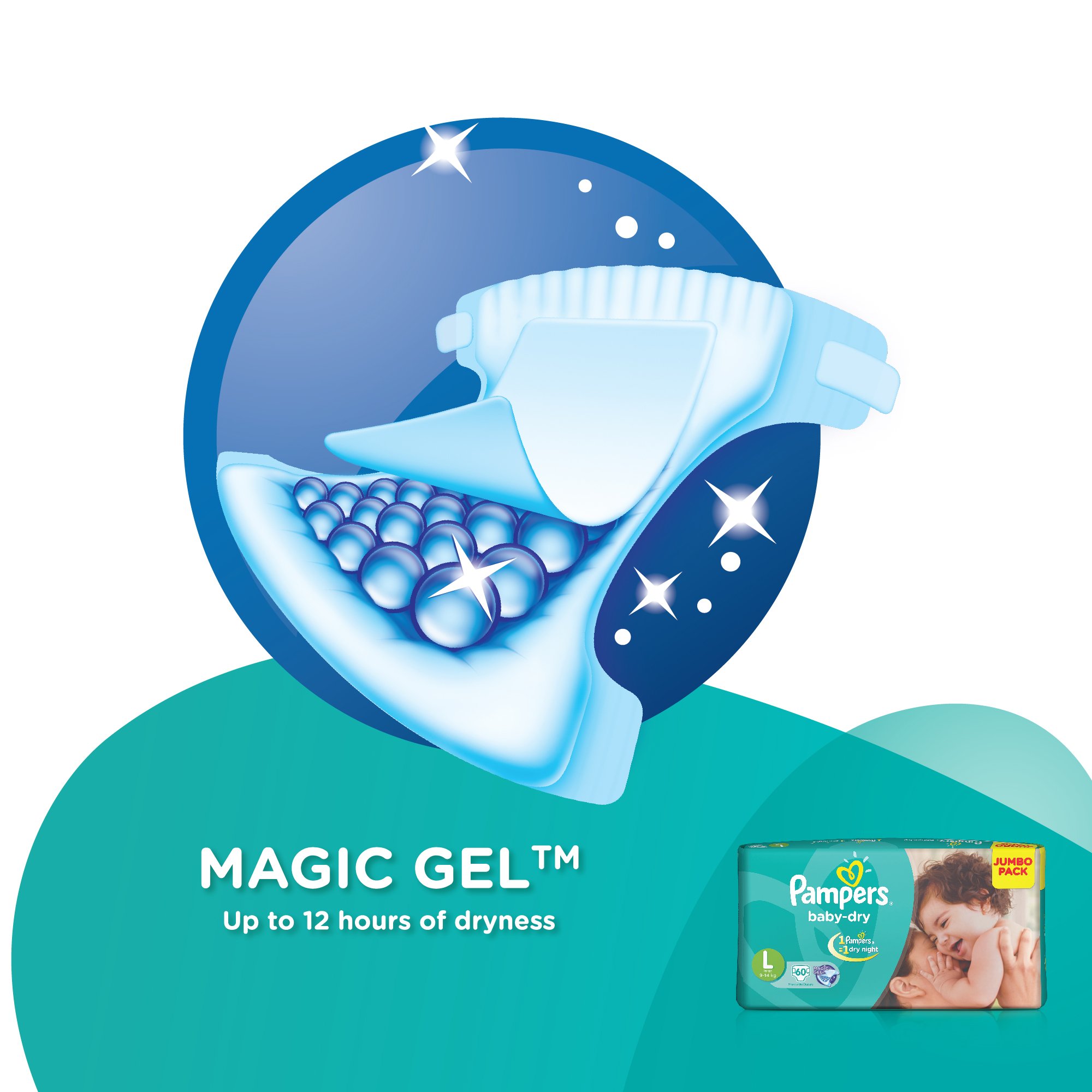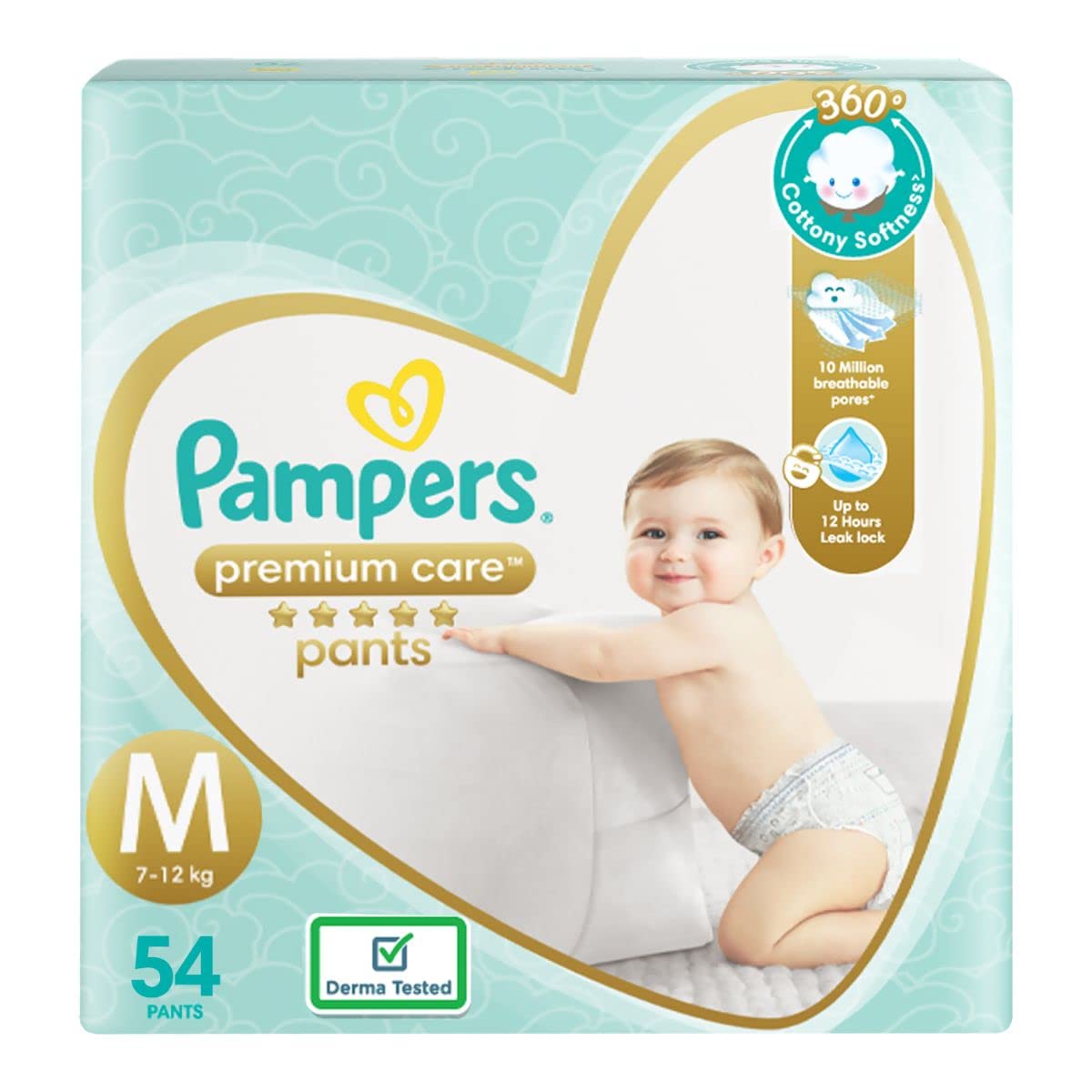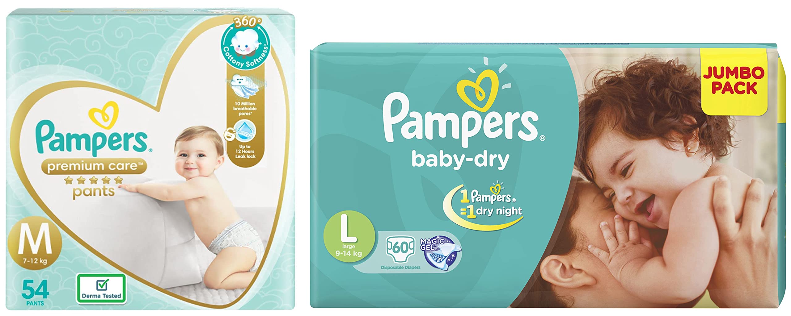 Pampers Taped Baby Diapers Large (LG) 60 countNEW & IMPROVED Pampers all-round protection pants have ANTI-RASH BLANKET* containing Lotion with Aloe Vera to keep your baby’s skin protected from redness irritation and rashes. quality diapers with 100% WETNESS LOCK keeps the pee locked inside & baby's bum stays dry for ALL NIGHT. Air channels & stretchy belt provides your baby breathable airy fit - comfortable even in summers. Pampers unique Magic gel technology provides up to 12 hours of dryness – and has 2X faster absorption. The new and improved product design enables a comfortable fit closer to the baby’s body and an EXTRA SOFT flexible waist band that adapts to baby’s movements for best comfort. Available in all sizes – Small diapers medium diaper pants large size diaper pants XL diapers XXL diapers XXXL diaper pants. A top layer with cotton-like soft material ensure a comfortable night’s sleep. Our pants with fun exterior graphics fun designs of characters and a delightful fresh Aloe fragrance ensures you enjoy every change with your baby. (*Blanket refers to soft topsheet with lotion. Helps prevent rash due to wetness after 1 day of usage based on clinical studies in USA 2000-2019).Pampers Premium Care Pants Medium size baby Diapers (M) 54 Count Softest ever Pampers PantsNew Pampers Premium Care Pants with 360 degree cottony softness gives your baby the ultimate comfort all day all night long. Pampers Premium Care Pants contain soothing lotion with Aloe Vera to protect your baby’s skin from rashes while its 10 million micropores allow your baby’s skin to breathe. Its 12-hour leak lock facility keeps your baby dry and away from wetness. Experience 5-Star comfort with unique added features like Wetness Indicator which turns Yellow to Blue indicating when you may change the diaper and a Disposal Tape to help you with easy disposal. Pampers Premium Pants are available in New-born (NB) S M L XL and XXL sizes.