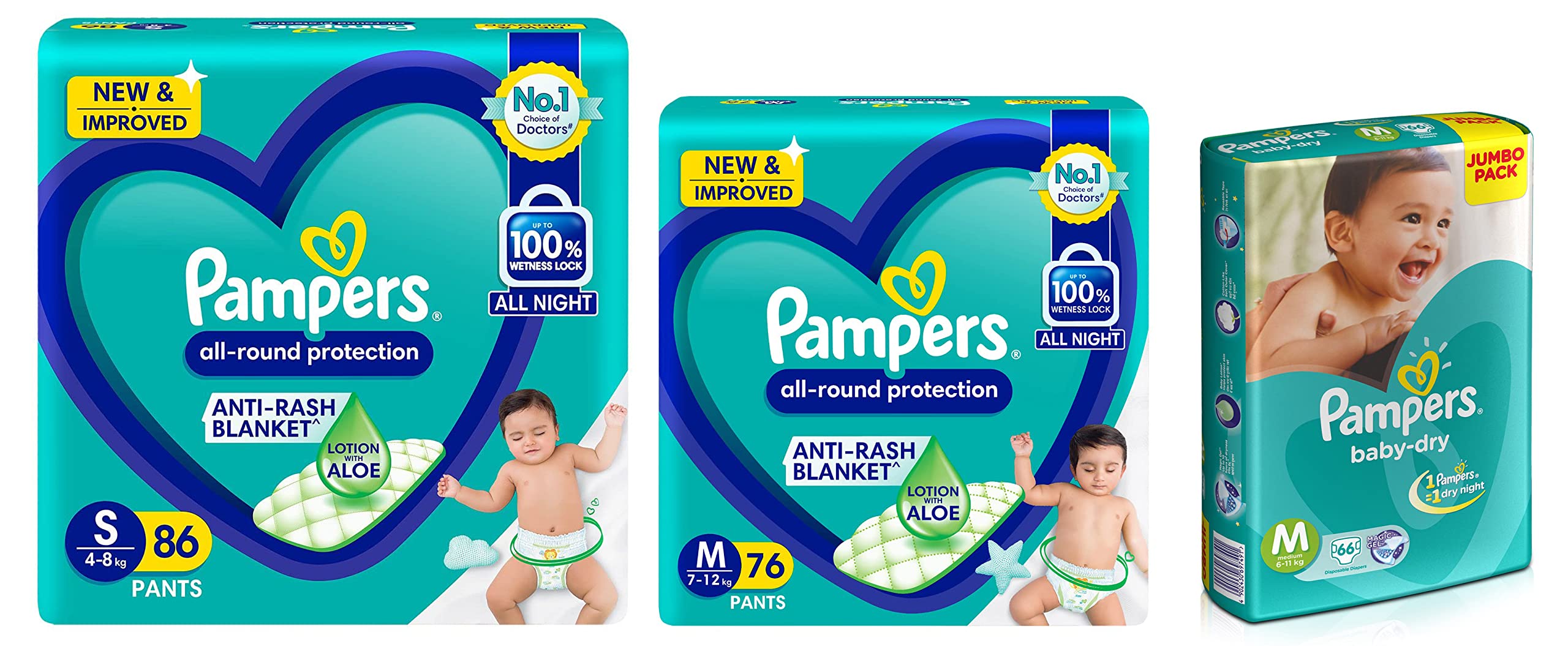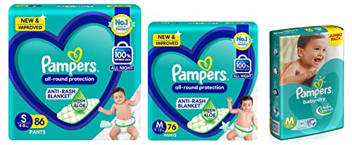 Pampers Taped Baby Diapers Medium (MD) 66 countNEW & IMPROVED Pampers all-round protection pants have ANTI-RASH BLANKET* containing Lotion with Aloe Vera to keep your baby’s skin protected from redness irritation and rashes. quality diapers with 100% WETNESS LOCK keeps the pee locked inside & baby's bum stays dry for ALL NIGHT. Air channels & stretchy belt provides your baby breathable airy fit - comfortable even in summers. Pampers unique Magic gel technology provides up to 12 hours of dryness – and has 2X faster absorption. The new and improved product design enables a comfortable fit closer to the baby’s body and an EXTRA SOFT flexible waist band that adapts to baby’s movements for best comfort. Available in all sizes – Small diapers medium diaper pants large size diaper pants XL diapers XXL diapers XXXL diaper pants. A top layer with cotton-like soft material ensure a comfortable night’s sleep. Our pants with fun exterior graphics fun designs of characters and a delightful fresh Aloe fragrance ensures you enjoy every change with your baby. (*Blanket refers to soft topsheet with lotion. Helps prevent rash due to wetness after 1 day of usage based on clinical studies in USA 2000-2019). view larger Size chart Now New Pampers with magic gel can absorb quicker and hence keep the skin dry for upto 10 hours. So your baby's skin will be dry throughout the night and give him a peaceful undisturbed golden sleep. When to Change a Diaper In the first couple of months you may find yourself changing diapers up to 10 times in 24 hours. Diapers should be changed whenever they are wet or soiled. Your baby will often (but not always) let you know. With a super-absorbent diaper like Pampers diapers you can tell if it's wet by urine indicator or by feeling for lumps in the absorbent material. Here are some common times for changing diapers: Right before or right after every feeding After every bowel movement Before bedtime When your baby wakes up When you go out with your baby The Art of Changing Diapers Pampers Diapers are designed to adjust to your baby's shape for a snug comfortable fit. While changing diapers there's no need to fold the waistband in or out or to adjust the leg cuffs. Place tabs parallel to the waistband and centered on the character strip. Use the characters as guides to ensure the fasteners are evenly spaced. Keep baby products such as powder away from the fasteners so they maintain their stickiness. Wiping baby bottoms Have a supply of baby wipes or clean wet tissues handy while changing diapers to help keep your baby clean and fresh. For baby girls while changing diapers always wipe from front to back to minimize the amount of stool material that gets near her genitals. Also be careful to clean all areas as the folds in the skin around her genitals can hide urine and soil. Treating and preventing diaper rash Red bumps on your baby's bottom may mean diaper rash. It can be caused by many factors including leaving urine or bowel movement on the skin too long between changing diapers or even as a result of taking antibiotics. And when your baby starts solid foods wait a few days between introducing each new food to see if the rash was caused by a particular food. If your baby has diaper rash clean the entire diapered area gently but thoroughly with a baby wipe or a clean wet tissue. It is also helpful to allow air to reach the skin. Talk to your paediatrician or pharmacist if the rash does not improve. Finding the right size Just like you babies like to wear things that fit just right. Choose a size that does not sag or gap even as your baby crawls and plays. This will help prevent leaks. Each product description on this site gives guidelines that represent the average weight for a particular size. And remember when you move up a size you gain absorbency. Weighing babies The easiest way to weigh your baby is to first hop on the scale yourself. See how much you weigh then see how much you weigh when you hold your baby. If you subtract your weight you'll know how much your baby weighs. Safe diapering You buy the latest toys and babies wind up playing with silly things - like diapers. It's important to keep diapers where they should be on your baby's bottom. Don't let your baby put the diaper in her mouth. Discard any diaper that has become torn or unsealed and read the warning label on all bags. Diaper gel facts AGM is the absorbent gelling material widely used in diaper padding to absorb wetness. It is perfectly normal to see some gel on the skin from time to time especially if the diaper is heavily saturated. It can easily be removed by wiping your baby's skin. This material has a long history of safe use in a variety of products and has been in diapers for more than a decade. Absorbent gelling material is closely related to ingredients widely used in cosmetics in food processing and as binders in medicine capsules. Waste removal As the Pampers bag recommends you'll want to dump bowel movements in the toilet. Then just roll the diaper into its backsheet using the tape or fasteners to keep it closed and dispose of it in the trash. Diaper storage Store your diapers in an area protected from extreme heat and humidity and away from products with fragrances. We recommend the diaper be kept in a dry storage area where the temperature is 85 degrees or less.Pampers All round Protection Pants Small size baby diapers (SM) 86 Count Anti Rash diapers Lotion with Aloe VeraNEW & IMPROVED Pampers all-round protection pants have ANTI-RASH BLANKET* containing Lotion with Aloe Vera to keep your baby’s skin protected from redness irritation and rashes. quality diapers with 100% WETNESS LOCK keeps the pee locked inside & baby's bum stays dry for ALL NIGHT. Air channels & stretchy belt provides your baby breathable airy fit - comfortable even in summers. Pampers unique Magic gel technology provides up to 12 hours of dryness – and has 2X faster absorption. The new and improved product desi