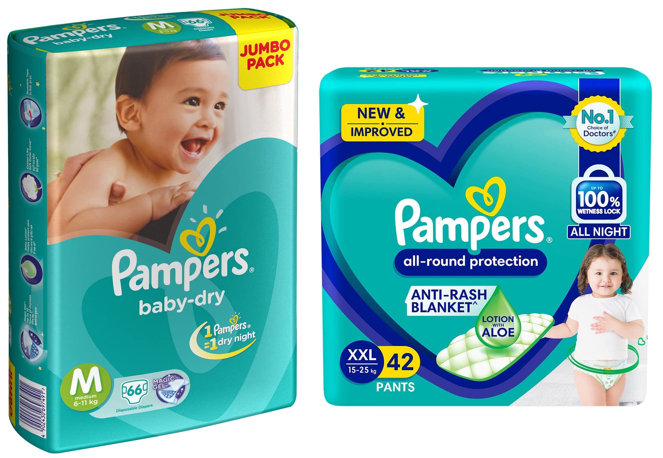 Pampers Taped Baby Diapers Medium (MD) 66 countNEW & IMPROVED Pampers all-round protection pants have ANTI-RASH BLANKET* containing Lotion with Aloe Vera to keep your baby’s skin protected from redness irritation and rashes. quality diapers with 100% WETNESS LOCK keeps the pee locked inside & baby's bum stays dry for ALL NIGHT. Air channels & stretchy belt provides your baby breathable airy fit - comfortable even in summers. Pampers unique Magic gel technology provides up to 12 hours of dryness – and has 2X faster absorption. The new and improved product design enables a comfortable fit closer to the baby’s body and an EXTRA SOFT flexible waist band that adapts to baby’s movements for best comfort. Available in all sizes – Small diapers medium diaper pants large size diaper pants XL diapers XXL diapers XXXL diaper pants. A top layer with cotton-like soft material ensure a comfortable night’s sleep. Our pants with fun exterior graphics fun designs of characters and a delightful fresh Aloe fragrance ensures you enjoy every change with your baby. (*Blanket refers to soft topsheet with lotion. Helps prevent rash due to wetness after 1 day of usage based on clinical studies in USA 2000-2019). view larger Size chart Now New Pampers with magic gel can absorb quicker and hence keep the skin dry for upto 10 hours. So your baby's skin will be dry throughout the night and give him a peaceful undisturbed golden sleep. When to Change a Diaper In the first couple of months you may find yourself changing diapers up to 10 times in 24 hours. Diapers should be changed whenever they are wet or soiled. Your baby will often (but not always) let you know. With a super-absorbent diaper like Pampers diapers you can tell if it's wet by urine indicator or by feeling for lumps in the absorbent material. Here are some common times for changing diapers: Right before or right after every feeding After every bowel movement Before bedtime When your baby wakes up When you go out with your baby The Art of Changing Diapers Pampers Diapers are designed to adjust to your baby's shape for a snug comfortable fit. While changing diapers there's no need to fold the waistband in or out or to adjust the leg cuffs. Place tabs parallel to the waistband and centered on the character strip. Use the characters as guides to ensure the fasteners are evenly spaced. Keep baby products such as powder away from the fasteners so they maintain their stickiness. Wiping baby bottoms Have a supply of baby wipes or clean wet tissues handy while changing diapers to help keep your baby clean and fresh. For baby girls while changing diapers always wipe from front to back to minimize the amount of stool material that gets near her genitals. Also be careful to clean all areas as the folds in the skin around her genitals can hide urine and soil. Treating and preventing diaper rash Red bumps on your baby's bottom may mean diaper rash. It can be caused by many factors including leaving urine or bowel movement on the skin too long between changing diapers or even as a result of taking antibiotics. And when your baby starts solid foods wait a few days between introducing each new food to see if the rash was caused by a particular food. If your baby has diaper rash clean the entire diapered area gently but thoroughly with a baby wipe or a clean wet tissue. It is also helpful to allow air to reach the skin. Talk to your paediatrician or pharmacist if the rash does not improve. Finding the right size Just like you babies like to wear things that fit just right. Choose a size that does not sag or gap even as your baby crawls and plays. This will help prevent leaks. Each product description on this site gives guidelines that represent the average weight for a particular size. And remember when you move up a size you gain absorbency. Weighing babies The easiest way to weigh your baby is to first hop on the scale yourself. See how much you weigh then see how much you weigh when you hold your baby. If you subtract your weight you'll know how much your baby weighs. Safe diapering You buy the latest toys and babies wind up playing with silly things - like diapers. It's important to keep diapers where they should be on your baby's bottom. Don't let your baby put the diaper in her mouth. Discard any diaper that has become torn or unsealed and read the warning label on all bags. Diaper gel facts AGM is the absorbent gelling material widely used in diaper padding to absorb wetness. It is perfectly normal to see some gel on the skin from time to time especially if the diaper is heavily saturated. It can easily be removed by wiping your baby's skin. This material has a long history of safe use in a variety of products and has been in diapers for more than a decade. Absorbent gelling material is closely related to ingredients widely used in cosmetics in food processing and as binders in medicine capsules. Waste removal As the Pampers bag recommends you'll want to dump bowel movements in the toilet. Then just roll the diaper into its backsheet using the tape or fasteners to keep it closed and dispose of it in the trash. Diaper storage Store your diapers in an area protected from extreme heat and humidity and away from products with fragrances. We recommend the diaper be kept in a dry storage area where the temperature is 85 degrees or less.Pampers All round Protection Pants Double Extra Large size baby diapers (XXL) 42 Count Anti Rash diapers Lotion with Aloe VeraNEW & IMPROVED Pampers all-round protection pants have ANTI-RASH BLANKET* containing Lotion with Aloe Vera to keep your baby’s skin protected from redness irritation and rashes. quality diapers with 100% WETNESS LOCK keeps the pee locked inside & baby's bum stays dry for ALL NIGHT. Air channels & stretchy belt provides your baby breathable airy fit - comfortable even in summers. Pampers unique Magic gel technology provides up to 12 hours of dryness – and has 2X faster absorption. The new and improve