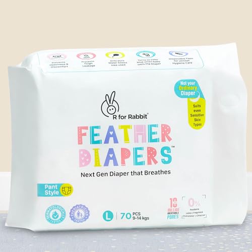 • Breathable Diapers: R for Rabbit Feather Large Size Diapers for L size having 10 Million* Breathable pores which allows the air to easily pass through making the diapers highly breathable and acting as a rash guard for your baby by instantly locking moist