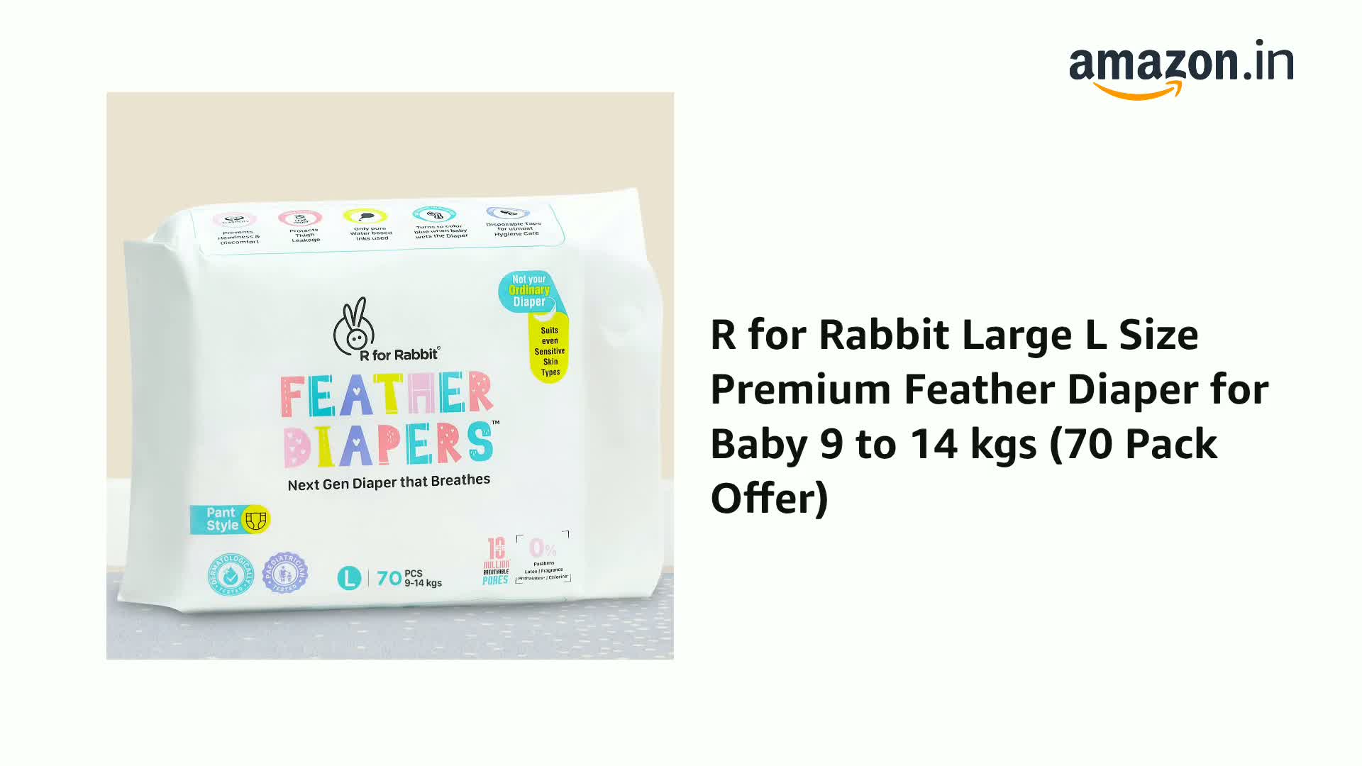 R for Rabbit Large L Size Premium Feather Diaper for Baby 9 to 14 kgs (70 Pack Offer)