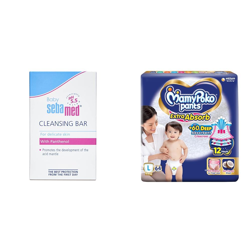 Sebamed Baby Cleansing Bar 150g|Ph 5.5 & MamyPoko Pants Extra Absorb Baby Diapers, Large (L), 64 Count, 9-14kg