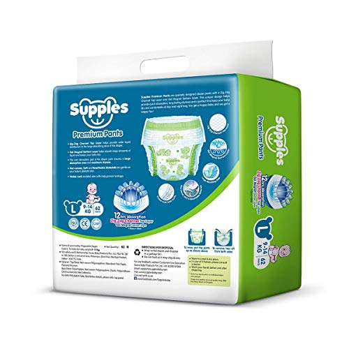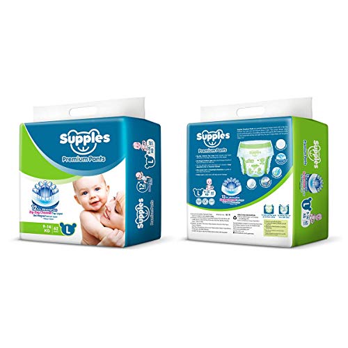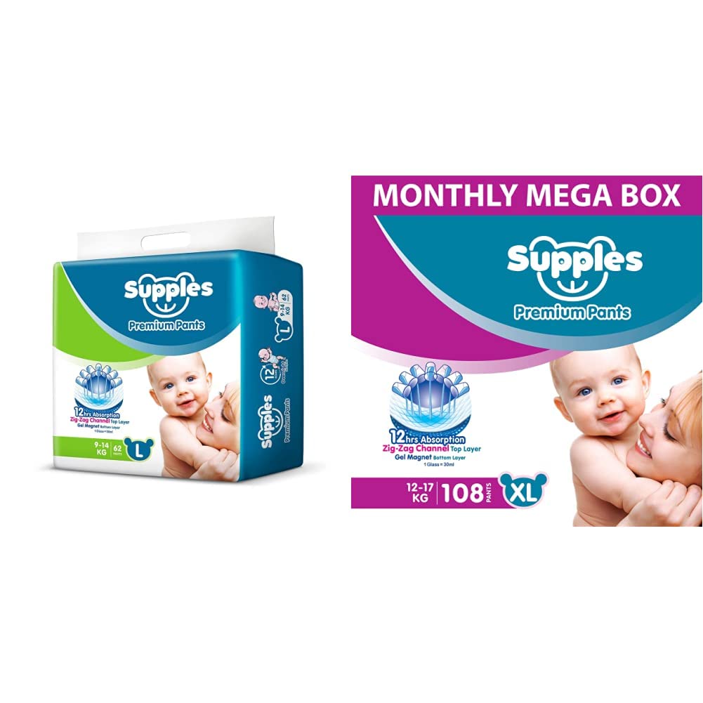 Supples Baby Pants Diapers Large 62 CountThese diaper pants keep your baby comfortable in the day as well as in night. Their cottony soft material is gentle on your baby skin keeping their precious skin perfect.Supples Baby Diaper Pants Monthly Mega-Box X-Large 108 CountThese diaper pants keep your baby comfortable in the day as well as in night. Their cottony soft material is gentle on your baby skin keeping their precious skin perfect.