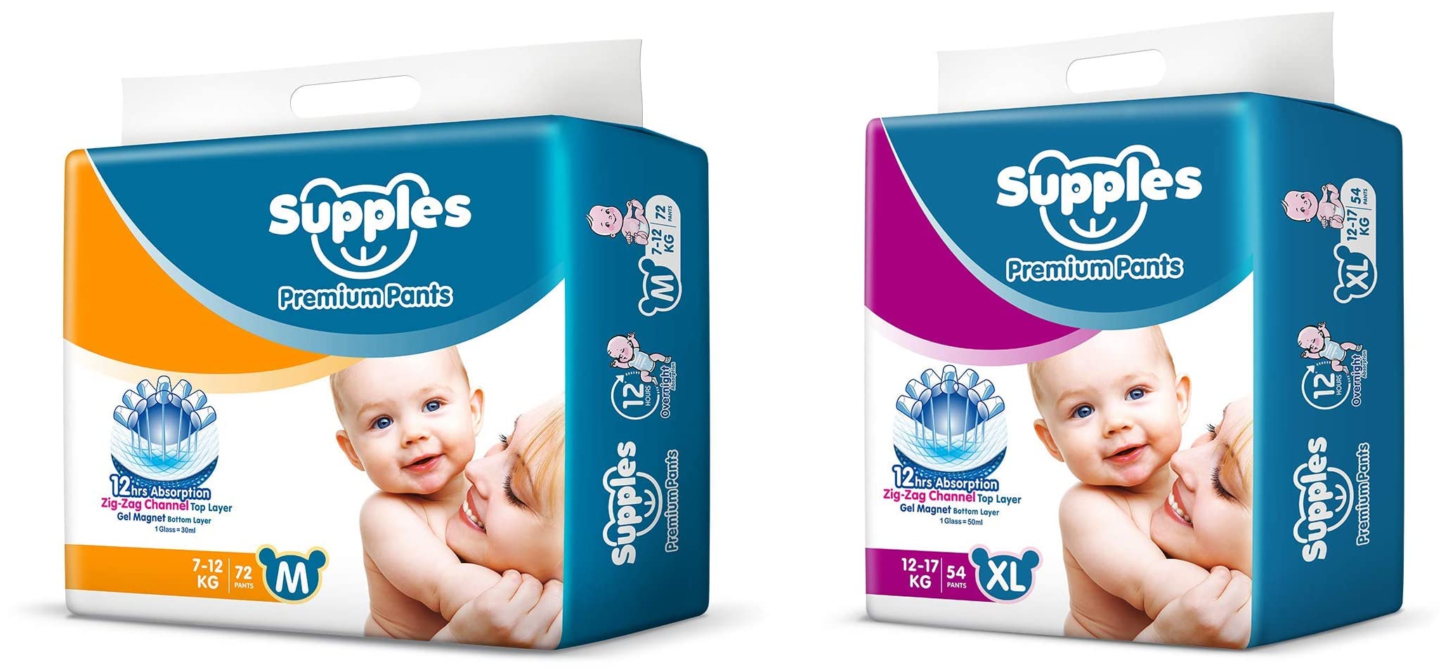 Supples Baby Pants Diapers Medium 72 CountThese diaper pants keep your baby comfortable in the day as well as in night. Their cottony soft material is gentle on your baby skin keeping their precious skin perfect.Supples Baby Pants Diapers X-Large 54 CountThese diaper pants keep your baby comfortable in the day as well as in night. Their cottony soft material is gentle on your baby skin keeping their precious skin perfect.