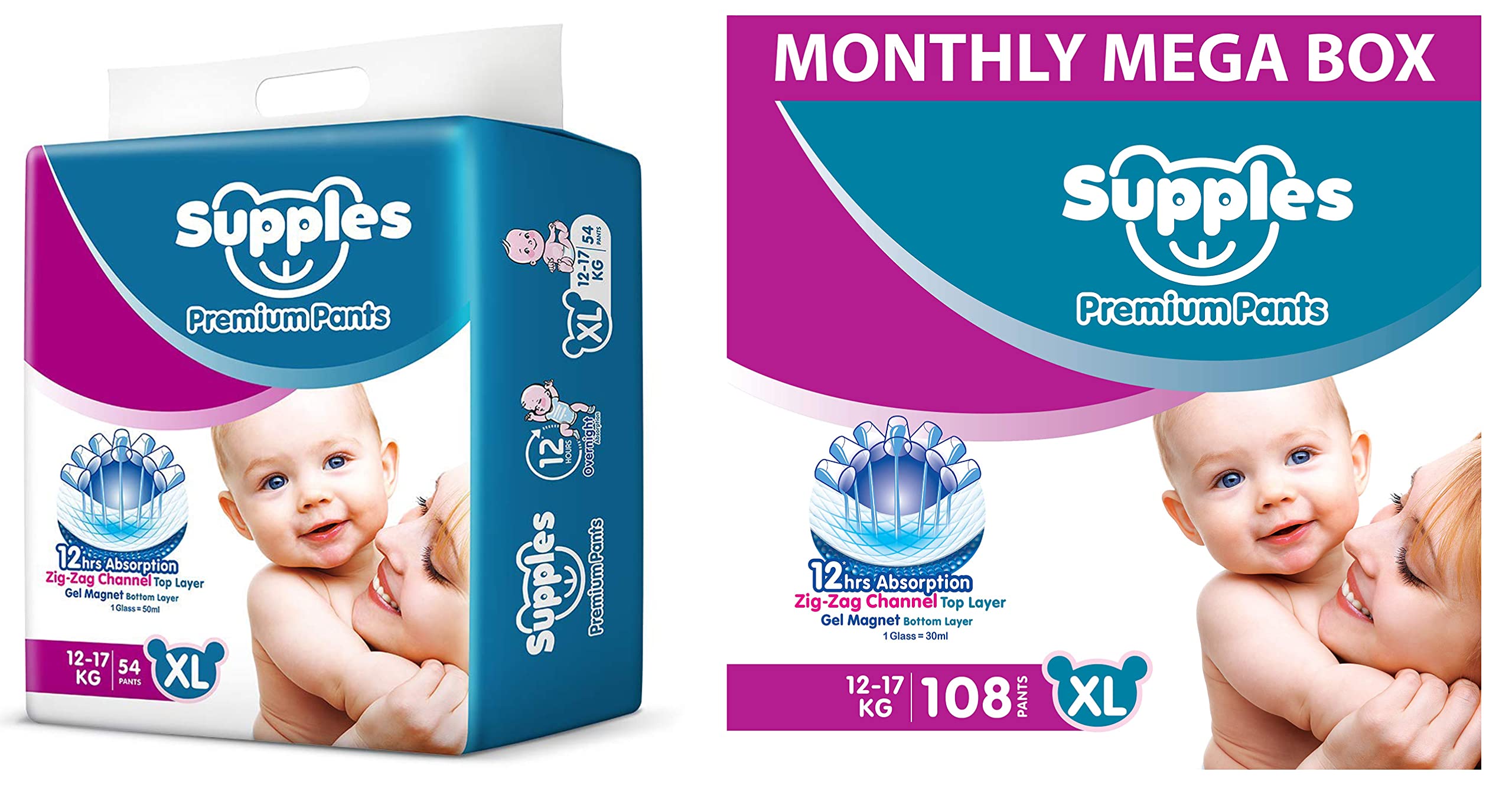 Supples Baby Pants Diapers X-Large 54 CountThese diaper pants keep your baby comfortable in the day as well as in night. Their cottony soft material is gentle on your baby skin keeping their precious skin perfect.Supples Baby Diaper Pants Monthly Mega-Box X-Large 108 CountThese diaper pants keep your baby comfortable in the day as well as in night. Their cottony soft material is gentle on your baby skin keeping their precious skin perfect.