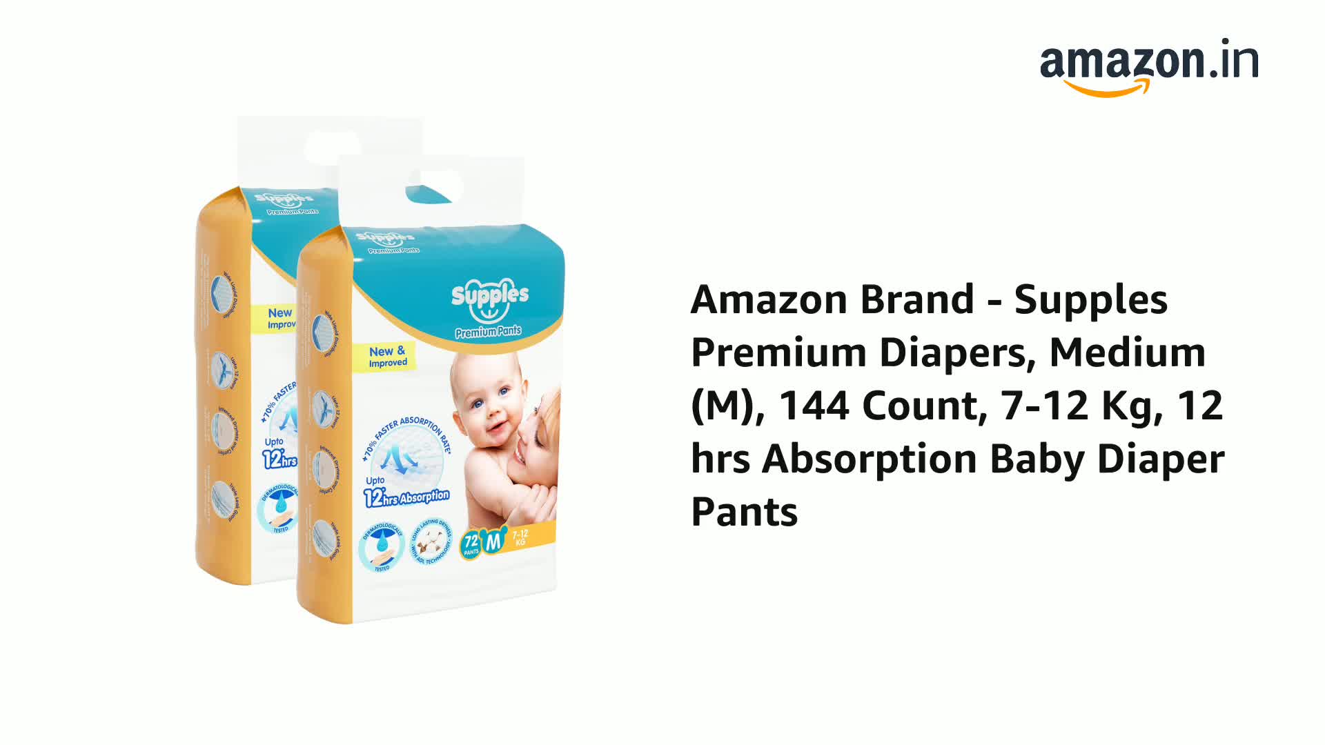 Amazon Brand - Supples Premium Baby Diaper Pants | 144 Baby Diapers | Medium | 7-12 Kg | 72 x 2 Packs | 12 Hrs Absorption | Cushiony Cotton Soft Fabric | Phthalates-Free | Triple Leak Guard