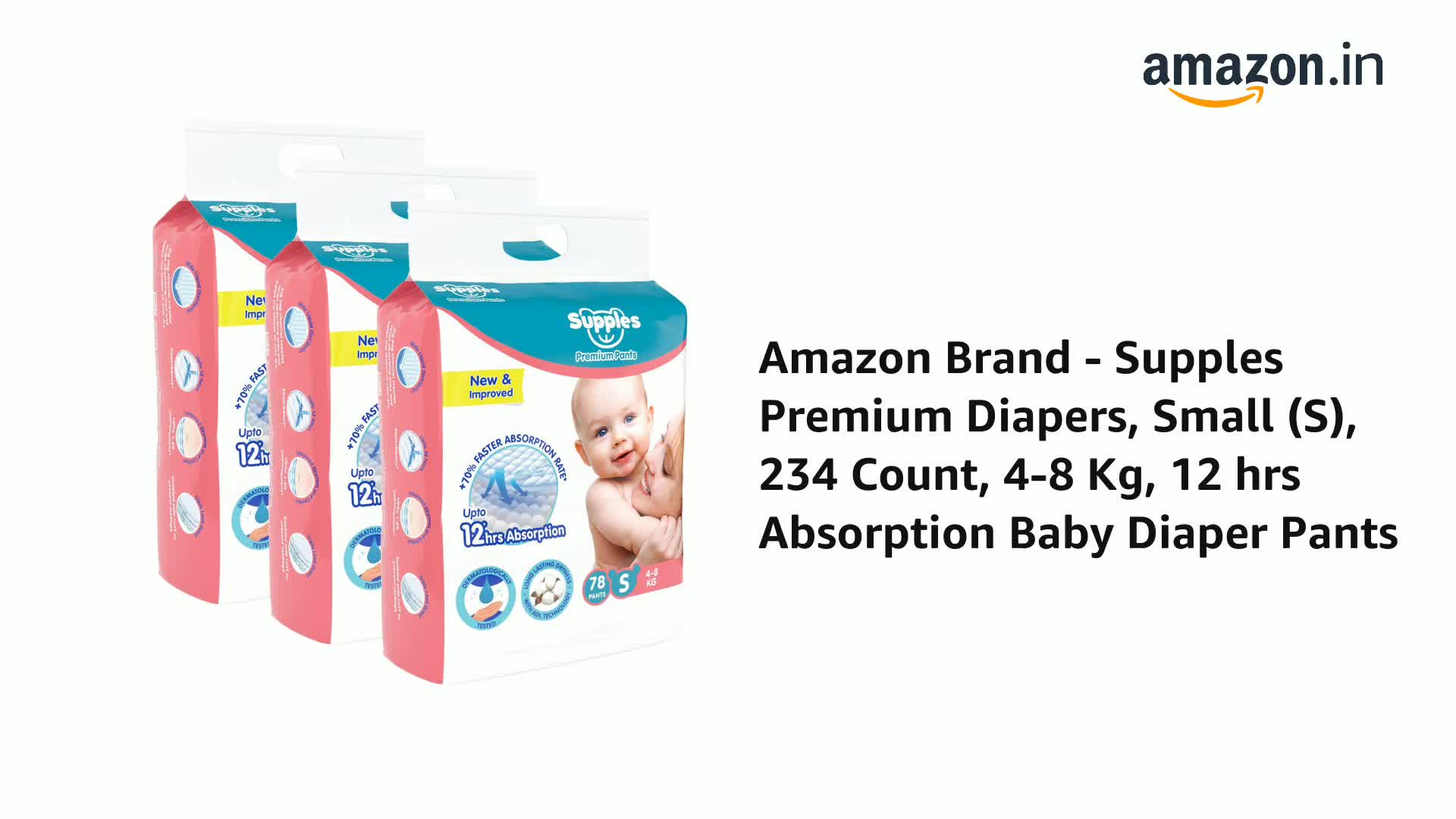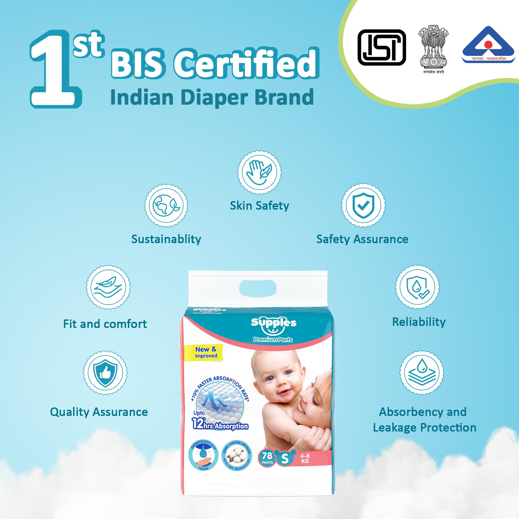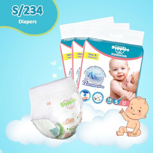SUPPLES PREMIUM DIAPER PANTS: Choosing the diaper for your baby is an important step in ensuring your little one comfort during the day as well as overnight. We understand that nothing is more important than the comfort of your little baby. With Supples Premium diaper pants we want to keep your baby comfortable both in day as well as in night thus delivering happiness to every doorstep. Choosing the right diaper size based on baby weight is important. The diaper capacity may vary among babies depending on the volume of pee and posture. Available in sizes NB S M L XL XXL