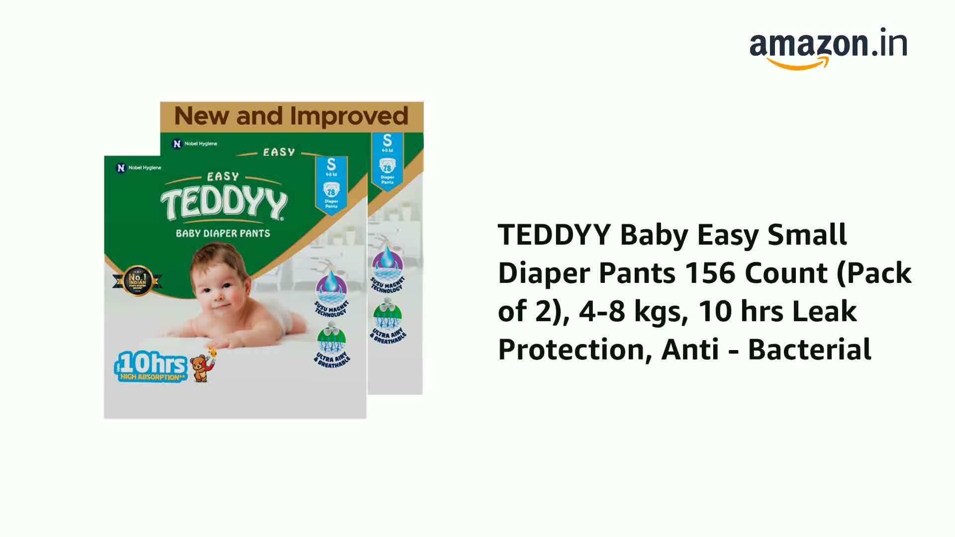 TEDDYY Baby Easy Small Diaper Pants 156 Count (Pack of 2), 4-8 kgs, 10 hrs Leak Protection, Anti - Bacterial
