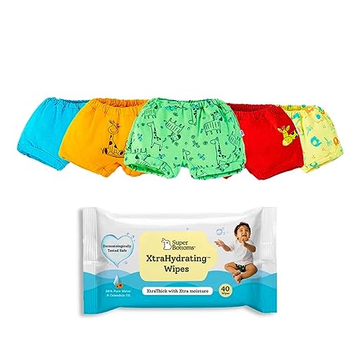superbottoms Basic™ Bloomer & 40pcs Wipes| Unisex, 100% Pure Cotton Innerwear | Breathable & Soft Underwear | Baby Bloomers for 6m 9m | Wonder Wild I Pack of 5