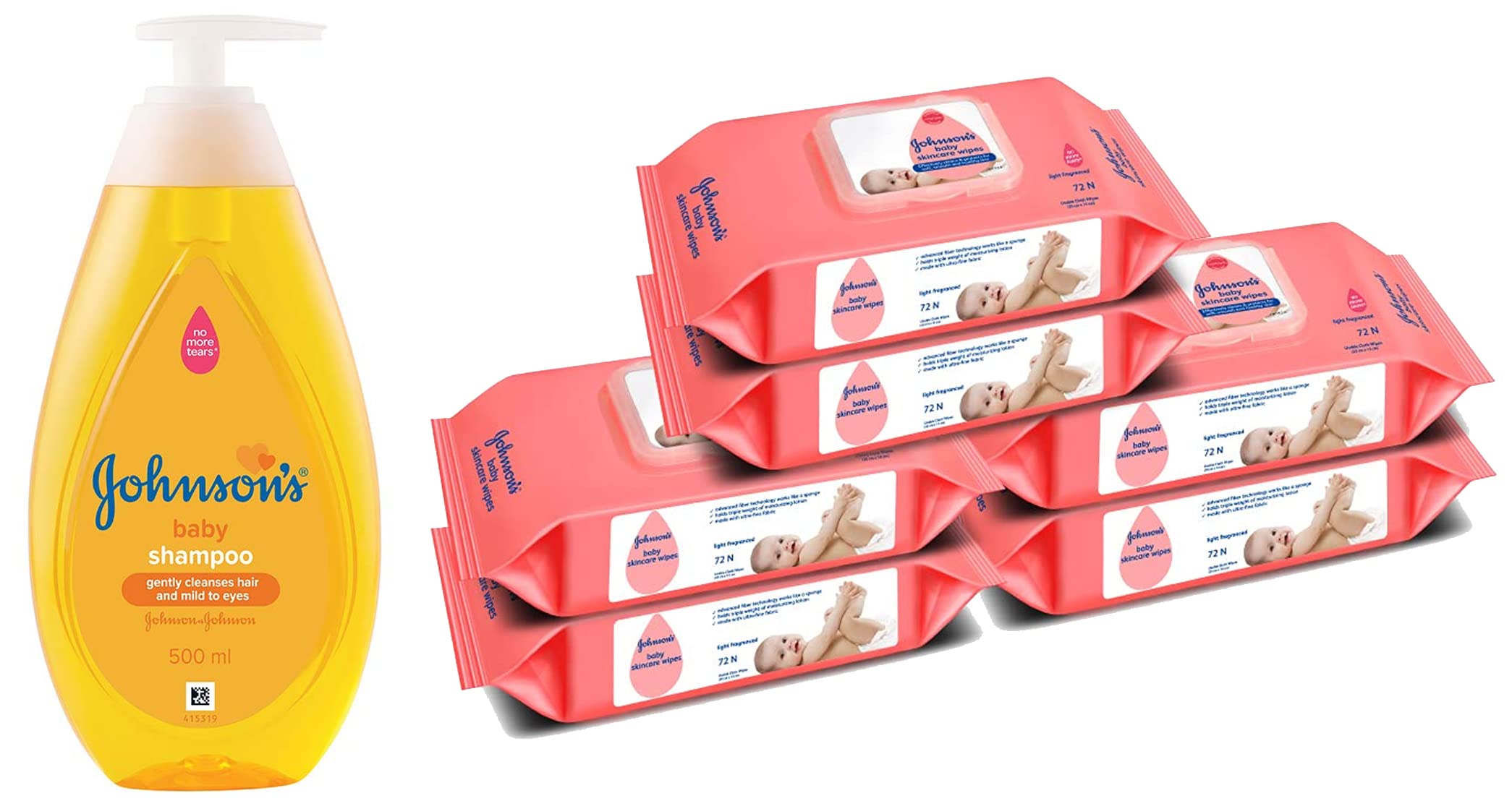 Johnson's Baby Skincare Wipes with Lid 72s Twin Pack (Buy 2 Get 1 Free) (432 Wet Wipes) WhiteDid you know? Repeated use of cloth and water can erode your baby's skin's natural protective layer. That's why Johnson's Baby Skincare Wipes are specially designed using innovative water-saturated fibre which packs 3 times the weight of moisturizing lotion to keep your baby's skin soft. Each wipe is enriched with moisturizing ingredients that help protect against redness rash and soothe skin by removing flakiness of dry and cracked skin. Johnson's Baby Skincare Wipes as mild to the skin as pure water provide soft and gentle care for delicate newborn skin. Moms trust Johnson's - always mild gentle and effective.Johnson's Baby No More Tears Baby Shampoo 500mlWhen a baby is born her hair are delicate and her eyes have slower blink reflexes vs. Adult eyes. Thats why we perfected our formulas over 125 years so they are now more gentle to give her the best care. Johnson's baby shampoo is specially designed to be as gentle and mild to the eyes as pure water. Johnson's baby no more tears shampoo is free of soap. It makes the rinsing of the hair very easy. You can clean the scalp and hair perfectly without leaving any adverse impact on the protective layer. Its anti-fungal and anti-bacterial properties prevent allergies or infections. Its no more tears formula cleanses gently and easily leaving your babys hair soft and healthy. Moms trust johnson's - always mild gentle and effective.