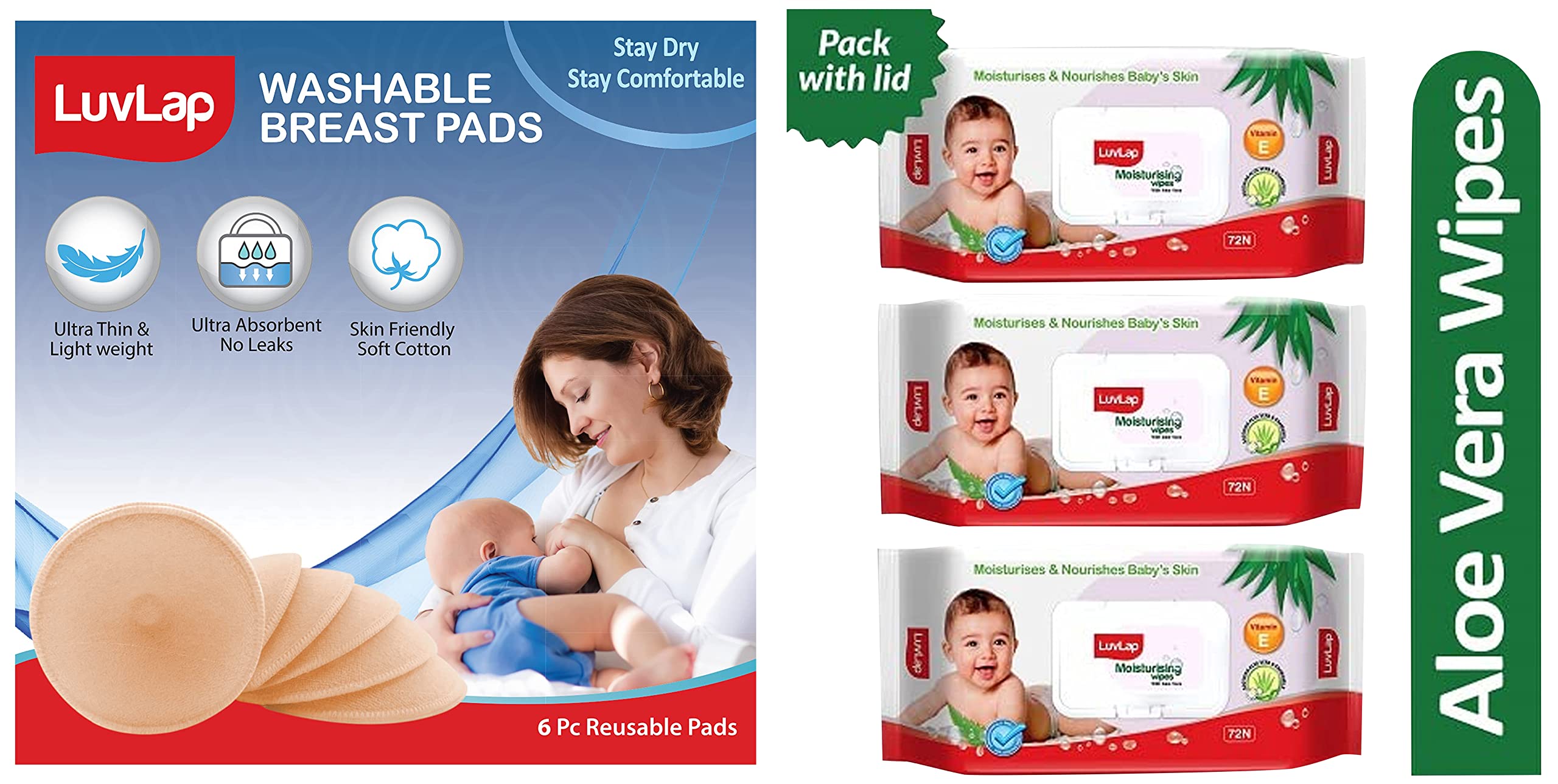 LuvLap Washable Maternity Nursing Breast Pads 6 Pcs Reusable Leak-proofLuvLap washable breast pads are super absorbant reusable pads that help prevent untimely leaks and keeps you dry and comfortable.LuvLap Paraben Free wipes for baby skin with Aloe Vera Fragrance Free pH Balanced Dermatologically Safe Baby Wipes Rich in Vitamin E & chamomile extract 72 Wipes / Pack With Lid Pack 3 packsLuvLap moisturizing baby wipes with aloe vera are the perfect wipes for your baby's delicate skin. Enriched with the goodness of aloe vera and chamomile they are completely free of alcohol and harmful parabens. The pack also comes with a lid seal to ensure the quality remains consistent over time. After all your baby's safety is our prime concern.