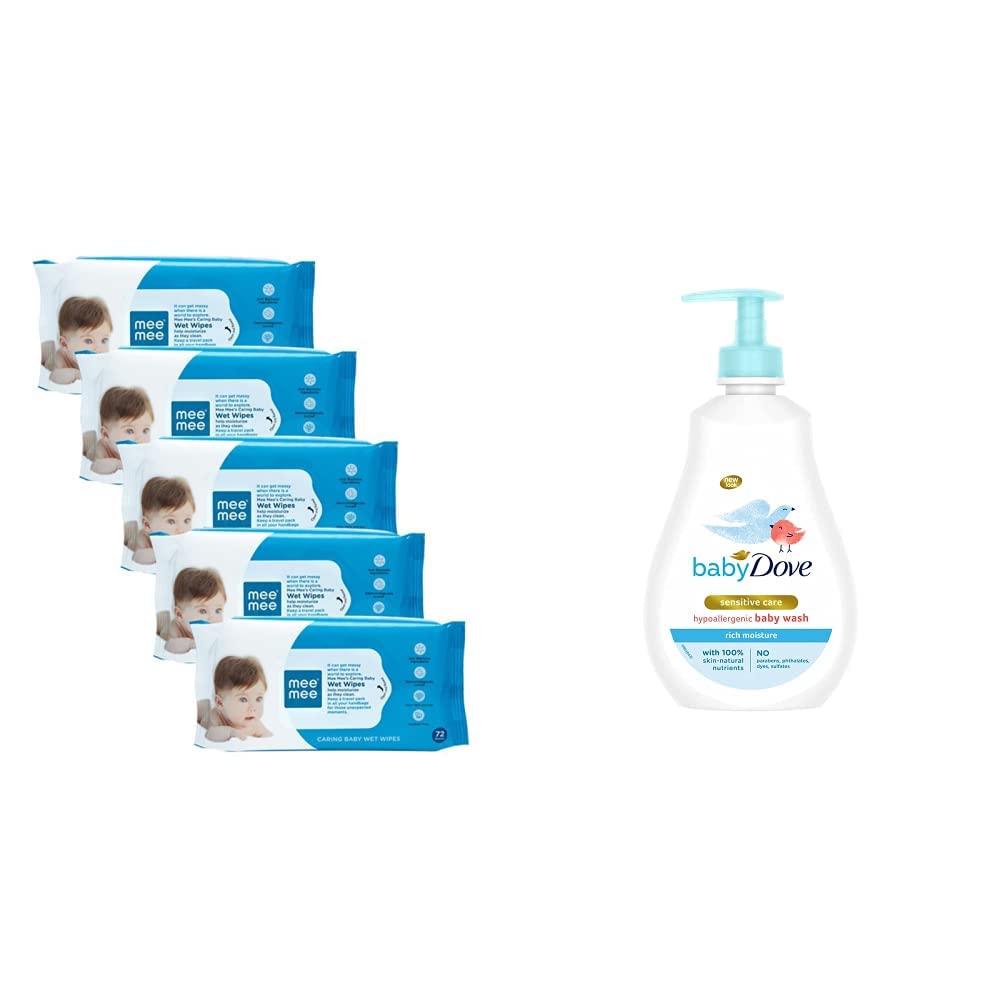 Mee Mee Baby Gentle Wet Wipes ((72 Pcs,Pack Of 05), Aloe Vera Wet Wipes)&Baby Dove Rich Moisture Hair To Toe Baby Wash, 400 Ml