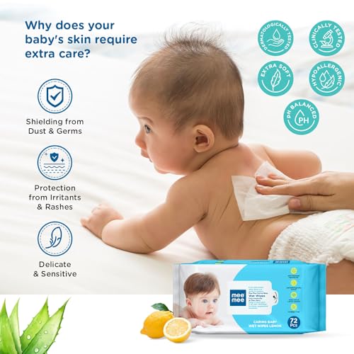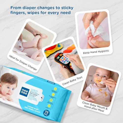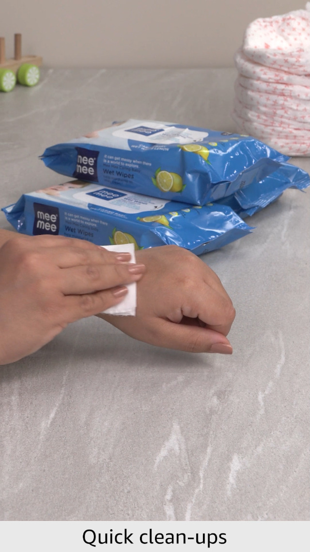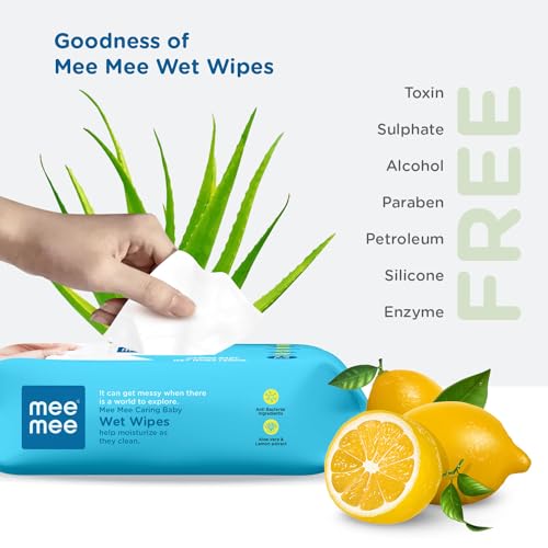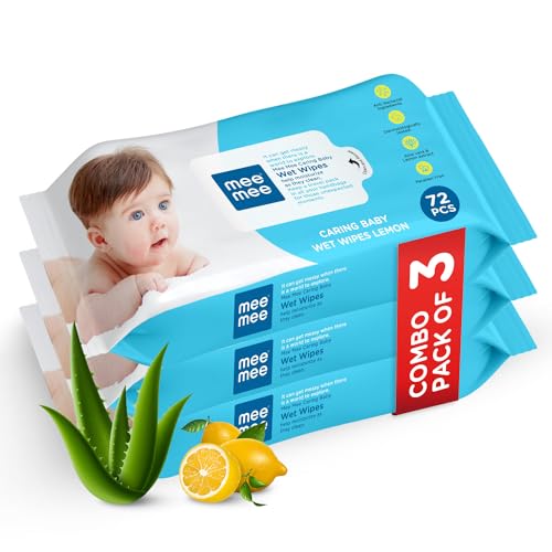 Product Description Imagine washing dirty tissues and clothes over and over again? You can wave this headache of yours goodbye when you opt for Mee Mee Baby Wet Wipes instead. These unique baby wipes are made of spun lace and non-woven material and are ideal for your baby sensitive and gentle skin. Manufacturers have made it an alcohol-free product and have infused it with a unique formula to ensure that your little one stays protected against redness rashes and any other bacterial infections. The aloe vera plant extract included in this wet wipe formula soothes and cools your baby skin and leaves it fresh and moisturised.These portable Mee Mee Baby Wipes have fresh and pleasant lemon fragrance that ensures your baby gets a fresh feeling and remains bacteria-free every time his or her diaper is changed. Besides its all important use during diaper or nappy changes this product can be used for many other purposes. If your baby has just started walking or has just begun to crawl he or she is bound to have dirty palms and knees. Use these wipes to clean your toddler after they have explored their home by crawling all day. These wipes can even be used by pre-school children to clean their hands before meals and after playtime. These baby wipes are also a perfect addition to your baby bag while you are travelling and may not have easy access to water. The pack contains 72 sheets. The re-sealable cover helps to keep the freshness and moisture of the wipes intact. It is highly recommended that you store it in a dry place to keep its freshness intact. Even with constant use of wipes your baby skin wont have any irritation rashes or side effects. This one has hypoallergenic agents and is clinically tested to protect your child gentle and extremely sensitive skin. So dont wait order it now and make your life easier and your baby a little more comfortable. From the Manufacturer Enriched with Aloe veraBabies have very sensitive skin and it is important that you choose baby wipes carefully. Mee Mee baby wipes come enriched with Aloe vera extracts to protect your baby's skin from allergies and other skin-related problems. Also these soothing Aloe vera extracts keep your little one's skin hydrated and cool. With a gentle refreshing lemon fragrance these wipes leave your baby smelling sweet long after a diaper change. Available in a compact portable pack Mee Mee wipes easily fit in handbags and can be carried around without any trouble. Moreover the Mee Mee baby wet wipes 3 pack with 8 sheets per pack is available at a reasonable price on Amazon.Soft FabricKeep your baby clean always with Mee Mee baby wet wipes. Made out of a spun lace non-woven fabric these are well suited to sensitive baby skin. The soft fabric ensures that there is no irritation even with constant wiping. The mild formulation infused in these Mee Mee wet wipes make them good for use on your little one's face and hands. Made out of hypoallergenic ingredients these baby wipes are 100 per cent safe for your little one's skin. These soft gentle and effective wipes are therefore perfect for both babies and toddlers. Dermatologically tested these wet wipes can be used to clean your child after meal time playtime or during travel.Brand: Mee MeeCount: 3 packs; 72 wipes per packContains: Aloe vera extractsLemon scentedTravel sizeSpun lace non-woven fabric soft and gentle on skinHypoallergenicDermatologist tested
