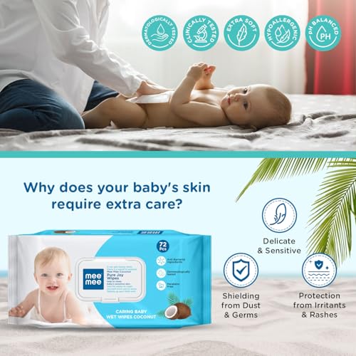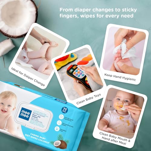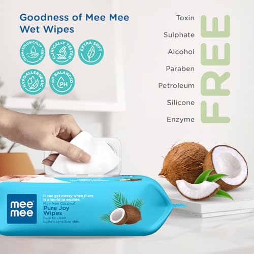 Introducing the Mee Mee Baby Wet Wipes with Flip-top Lid and Coconut Extracts the perfect companion for all your baby's cleaning needs. Specially designed with utmost care and consideration these wipes are a must-have essential for parents on the go. Each pack contains 72 premium-quality wipes that are soft gentle and effective in cleansing your baby's delicate skin. The fliptop lid ensures easy one-handed access making diaper changes and messy clean-ups a breeze. No more fumbling with sticky adhesive seals! Infused with the goodness of Coconut extracts these wipes are not only excellent at wiping away dirt and impurities but also help soothe and moisturize your little one's skin leaving it soft and supple. The hypoallergenic and dermatologically tested formula ensures they are safe and suitable for even the most sensitive skin. Mee Mee a trusted name in baby care products guarantees that these wipes are free from harmful chemicals like parabens alcohol and artificial fragrances. With a triple pack convenience you'll never run out of wipes when you need them most! Ensure your baby experiences the gentlest care with Mee Mee Baby Wet Wipes with Flip-top Lid and Coconut Extracts. Order now and embrace the joy of worry-free parenting!