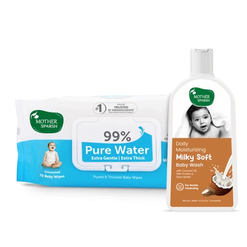 Mother Sparsh 99% Pure Water Baby Wipes, (Unscented) | 72 Pcs | With Milky Baby Wash 200ml