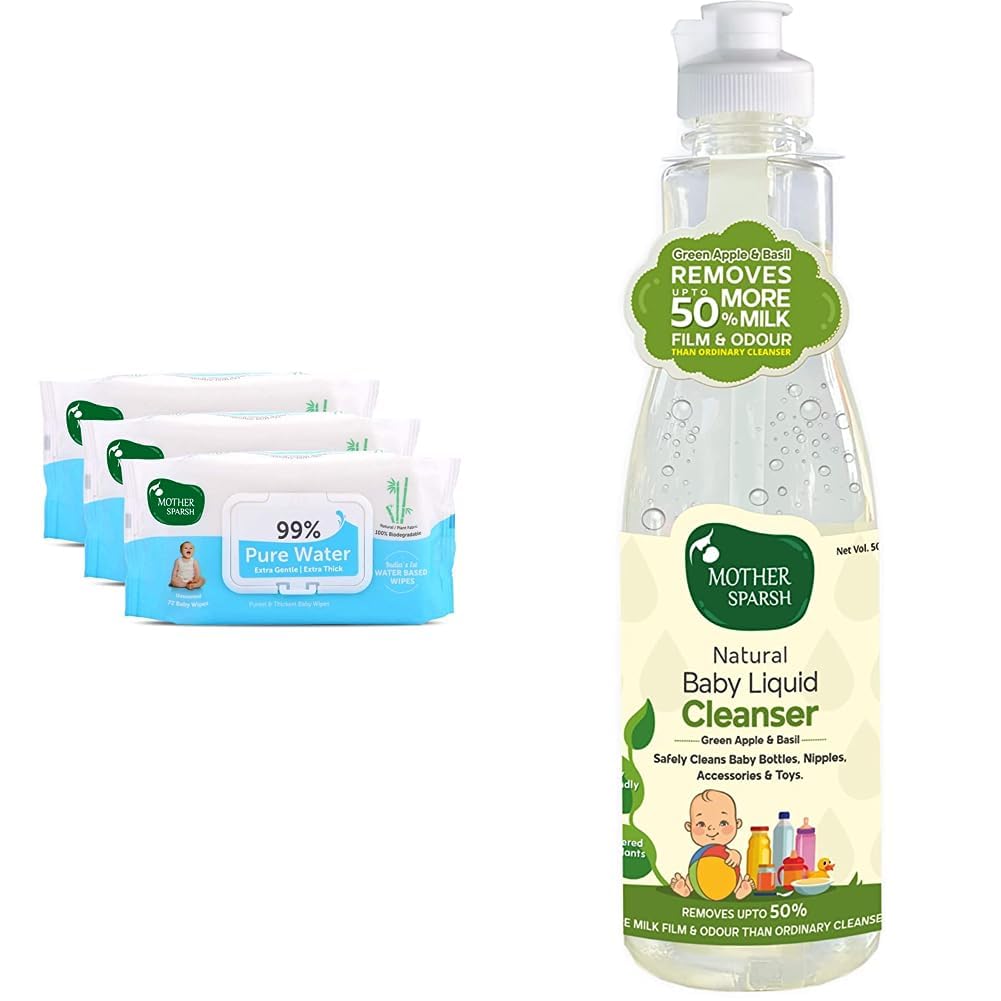 Mother Sparsh 99% Pure Water (Unscented) Baby Wipes I Natural Plant Made Cloth - Super Thick I 72 pcs/Pack - Pack of 3Mother Sparsh 99% Pure Water Based Wipes contain the goodness of pure water with no harsh fragrance and added velvety soft fabric that makes them perfect for cleaning baby's sensitive skin. Instead of plastic and petrochemicals derived fabric these baby wipes are made from super soft plant derived fabric that makes them gentle for baby's skin and environment too.Mother Sparsh Plant Powered Natural Baby Liquid Cleanser with Basil & Green Apple Extract | for Baby Bottles Nipples Accessories and Toys Cleaning - 500mlAn ultimate natural liquid cleanser by Mother Sparsh comes with the presence of plant derived ingredients that are highly effective in eliminating milk bacteria removing tough stains and odour from baby feeding bottles nipples and other accessories. However the formulation makes this cleanser safe and natural to use.