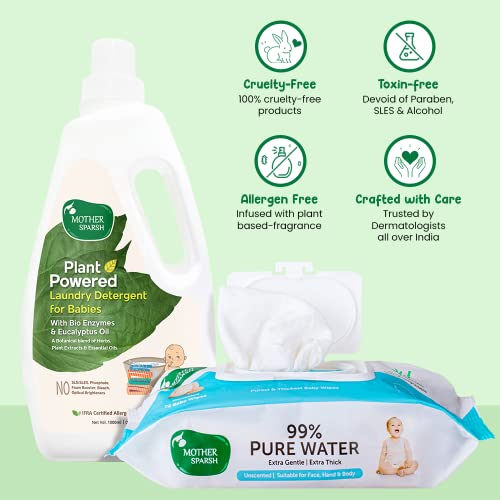 HomeBabyDiaperingBaby WipesMother Sparsh 99% Pure Water (Unscented) Baby Wipes- Super Thick I 72 pc + Baby Laundry Liquid Detergent (Powered by Plants) with Bio -1L
