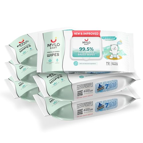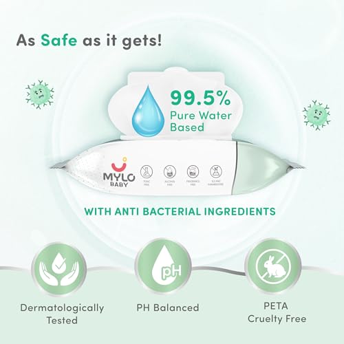 Mylo Baby 99.5% pure water-based wipes provide the gentlest and safest way to cleanse your babyâs delicate skin. Our baby wipes are the purest wipes that you can use for your little one since they undergo a 7 Stage Water Purification Process are made with 100% Natural Plant Based Fabric i.e plant derived fibres are enriched with Aquaxyl which provides 30% more hydration than wipes with glycerine. Our baby water wipes are dermatologically tested making them absolutely safe for your babyâs delicate skin. These baby wipes are PETA Certified cruelty-Free Vegan Friendly Certified pH balanced and also contain anti-bacterial ingredients. Not to forget our baby wipes do not contain any harmful chemicals be it toxins fragrances alcohol SLS or parabens. Our premium baby wipes are suitable for the entire family as they help to remove makeup gently clean surfaces instantly relieve diaper rashes and also keep the hands hygienic.
