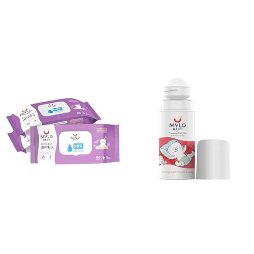 Mylo Baby Gentle Wipes With Lid (Pack of 3) | 80 Wipes & Mylo Baby Tummy Roll On (40ml) | 98% Pure Water | Made Safe Certified | with Hing & Saunf | Relieves Gas & Colic | Reduces Acid Reflux