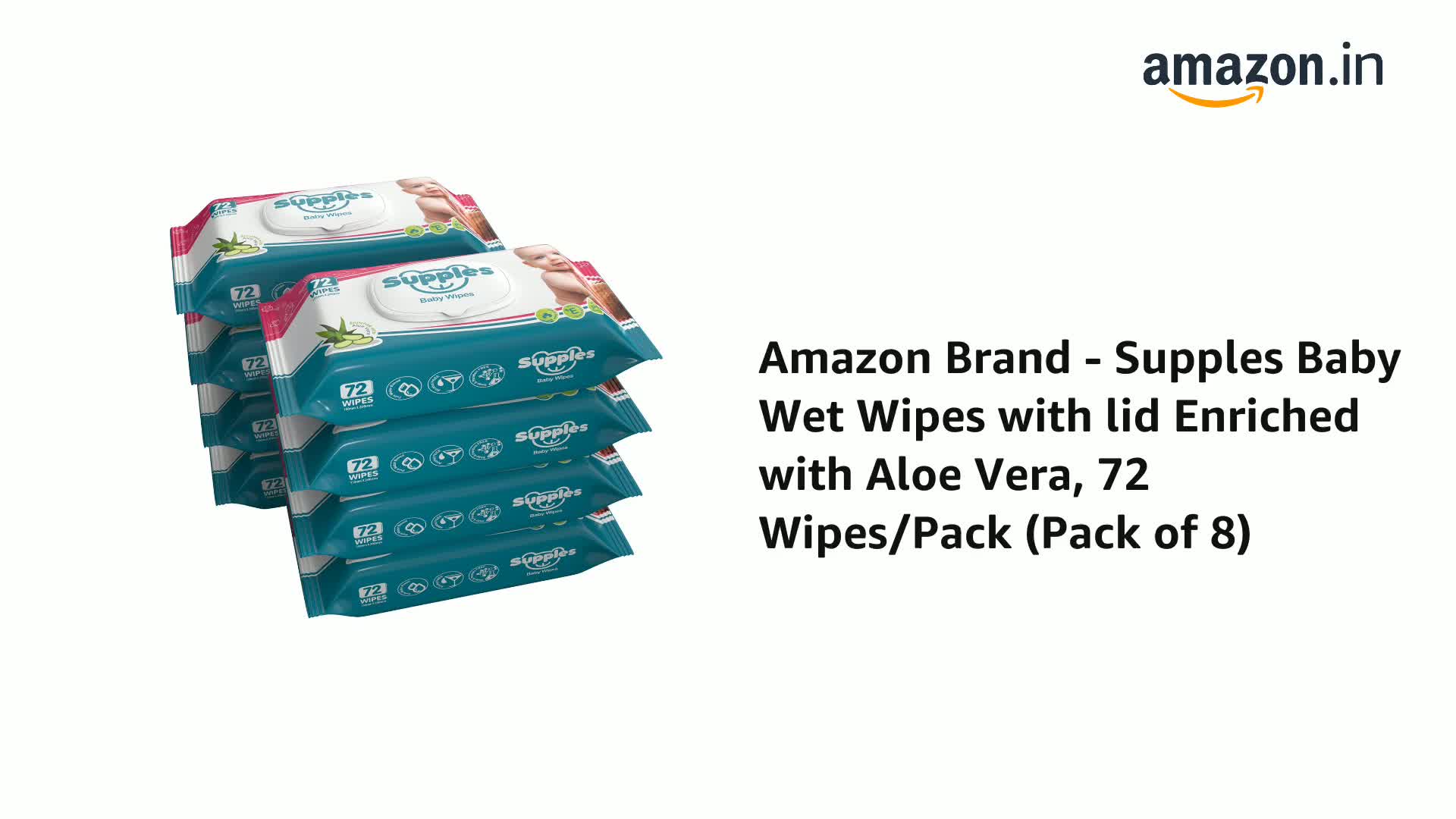 HomeBabyDiaperingBaby WipesAmazon Brand - Supples Baby Wet Wipes with Lid | 576 Wipes | 72 Wipes x 8 Packs | Enriched With Aloe Vera and Vitamin E | Alcohol-Free and Paraben-Free | Pure Water-Based formulation