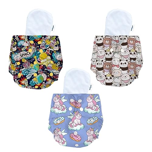 BUMTUM Cloth Diapers for Babies 0 to 3 Years | Pack of 3 with Inserts | Reusable Diaper for New Born Baby Cloth Diapers 5hrs Absorbency Freesize Washable Cotton(Unicorn Teddy Face & Space Old)