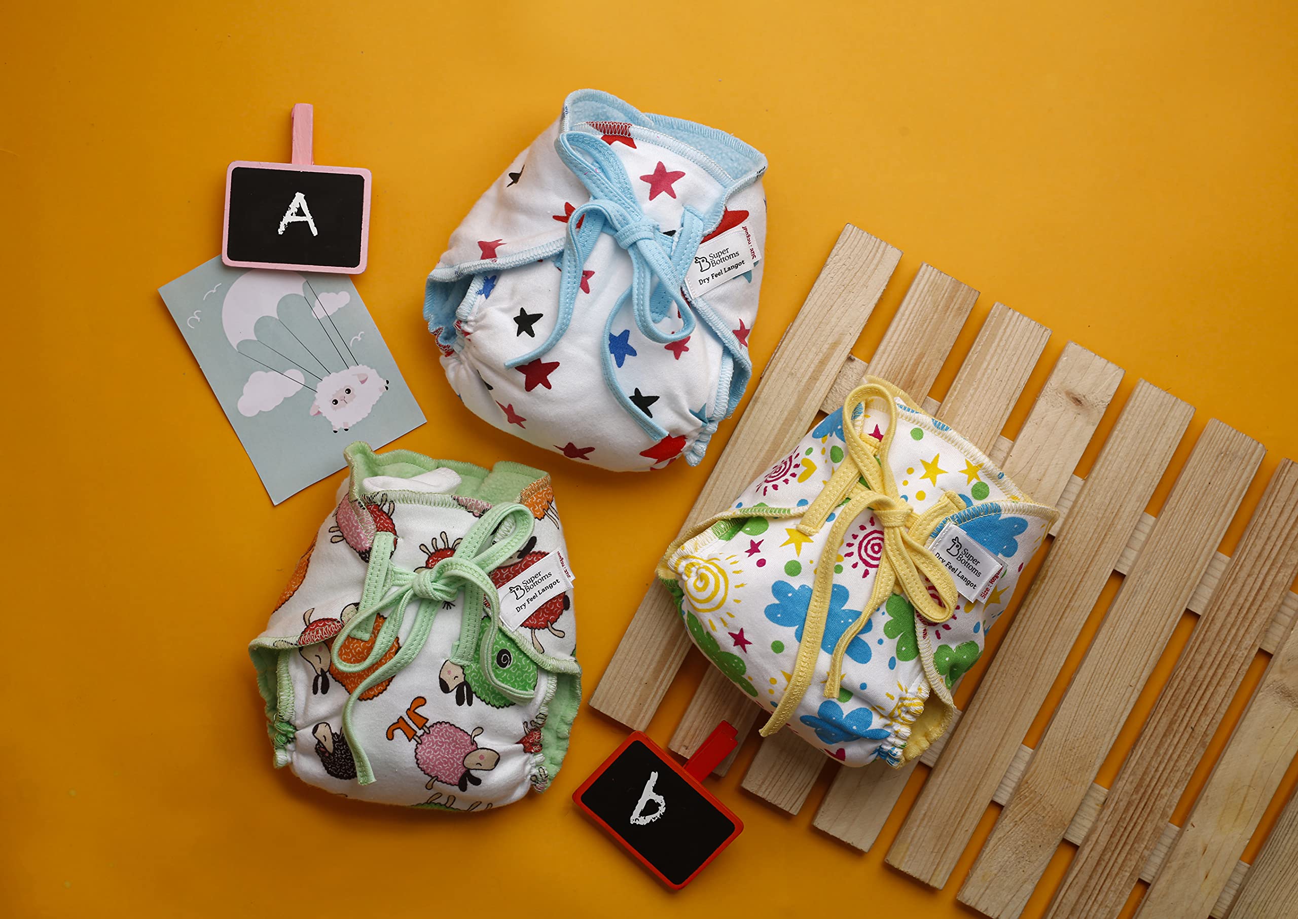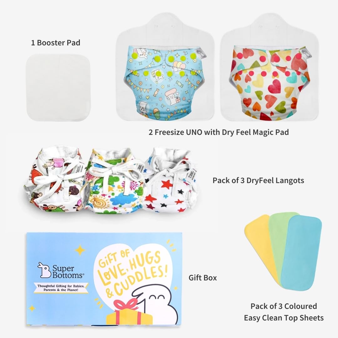 SuperBottoms brings you the perfect gift box to delight the little ones. This gift box contains 2 Freesize UNO (New Version) Pack of 3 DryFeel Langot 1 Booster Pad and 3 Coloured Easy Clean Top Sheets all packed elegantly in a gorgeous-looking box. This is a perfect gift you can give to new parents. Freesize UNO: SuperBottoms Freesize UNO cloth diaper is made from 100% Organic Cotton Pads with Super DryFeel Layer that keeps babys bums dry and helps in reducing rashes significantly. It is a washable and reusable cloth diaper which makes it pocket-friendly as well as eco-friendly. It is ideal for babies from 7 kg - 17 kg. DryFeel Langot: The DryFeel Langot has 3 layers of cotton padding with Super DryFeel Layer on the inside that helps to hold up to 1 pee. The gentle elastics at the back and thighs will give your baby a comfortable fit. Booster Pad: Booster Pad is made of 8 layers of Organic Cotton and is to be used in addition to the Dry Feel Magic Pad for boosting the absorbency of the SuperBottoms Freesize UNO making it ideal for night time use. The foldable design makes the pads dry very fast making them ideal for monsoon and winter seasons. Easy Clean Top Sheets: The Easy Clean Top Sheets are essentially diaper liners with Super DryFeel Layer that stay dry and can be placed over the Dry Feel Magic Pad which helps to easily clean babys poop.