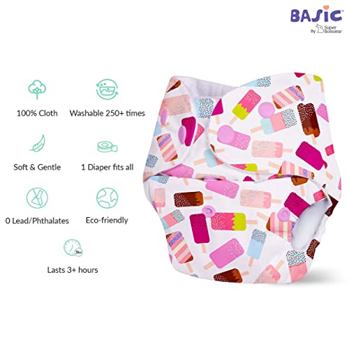 SuperBottoms BASIC Cloth Diaper For Baby | Washable & Reusable Cotton Cloth Diaper | 0-3 Years | Freesize | Adjustable | Reduces Rash | With 2 Quick Dry Pad/Insert | Ice Cream |