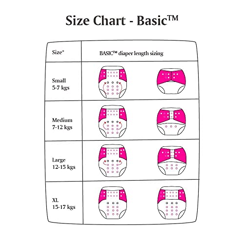 WATERPROOF ADJUSTABLE FREESIZE REUSABLE - Basic cloth diapers fit babies from 5kgs to 17kgs. You can easily adjust the size of the diaper to Small/Medium or Large/Extra Large depending on your baby's weight by snapping the buttons in the front. This helps