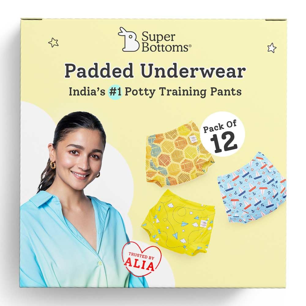 SuperBottoms Padded Underwear™ | For Potty Training & Mess-Free Diaper-Free time | Prevents Pee Puddles | 3 layers of Premium Cotton Padding (No sponge) | (Explorer, Size: 1, Pack of 12)