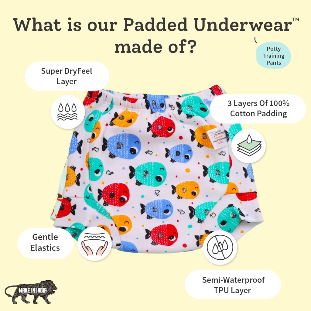 • Padded Underwear: A must-have for mess-free diaper-free time. With 3 layers of padding its perfect for babies when they need a break from diapers. It can hold up to 1 pee is semi-waterproof and has a SuperDryFeel layer on top to keep babies dry and mess-f