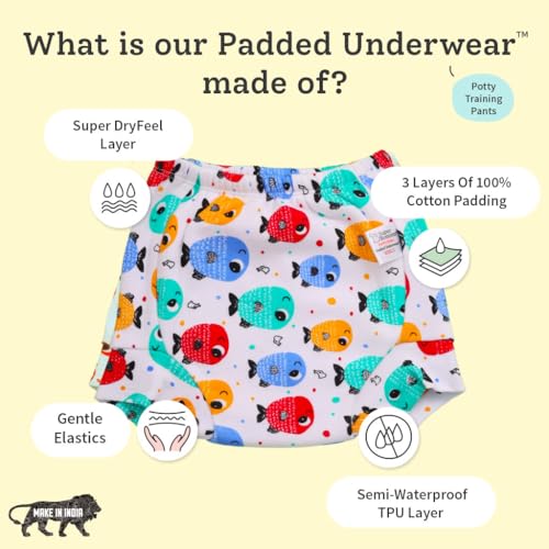 • Padded Underwear: A must-have for mess-free diaper-free time. With 3 layers of padding its perfect for babies when they need a break from diapers. It can hold up to 1 pee is semi-waterproof and has a SuperDryFeel layer on top to keep babies dry and mess-f
