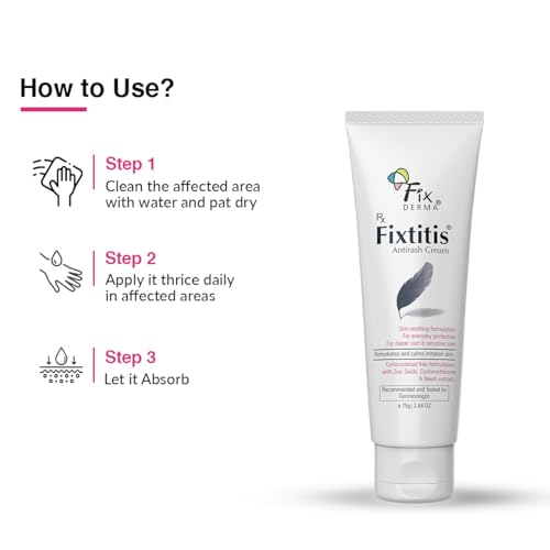• DIRECTIONS FOR USE: Clean the affected area with water and pat it dry. Apply Fixtitis anti-rash cream to the affected areas thrice daily as needed leave it uncovered. To treat diaper rash Fixtitis cream is normally applied at every diaper change until the