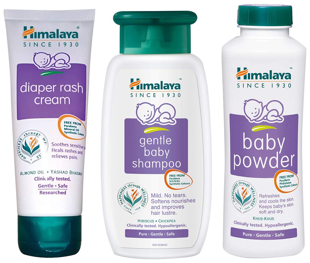 Himalaya Baby Powder (400g)Avoid using around baby eyes nose mouth and sensitive areas. Do not sprinkle directly onto baby skin to avoid accidental inhalation.Himalaya Gentle Baby Shampoo (200ml)Himalaya Gentle Baby Shampoo (200ml) Natural Care for Your Baby's Hair Himalaya Herbals baby care shampoo is enriched with natural sources of protein that leave your baby's hair soft and nourished. This gentle baby shampoo is formulated to cleanse and strengthen your little one's hair without any teary-eyed blues. It is so gentle that your tot is definitely going to love it. Himalaya shampoo is in essence a natural shampoo containing no harsh chemicals. It boasts anti-inflammatory and soothing properties to protect and care for your baby's tender scalp. All in all it is an essential baby care product that helps you get rid of dirt and other harmful infectious particles from your child's scalp without damaging it. Gentle Baby Shampoo for Healthy Baby Tresses The mild and soft Himalaya herbal shampoo moisturises and nourishes your baby's hair improving its texture. Its core ingredients include chickpea hibiscus and khus khus. The protein-rich chickpea leaves the hair strong and shiny while hibiscus acts as a natural conditioner to make it soft and smooth. Khus-khus soothes the baby's scalp with its antibacterial and antifungal properties. These natural ingredients make Himalaya baby care shampoo perfectly safe for daily use. It cleanses disinfects and leaves behind a mild scent and lustre with its ideal pH balance. Easy to use just apply this Himalaya 200ml Gentle Baby Shampoo lather and rinse well to get those shiny baby locks instantly. Brand: Himalaya Age: Newborn and up Contains: Chickpea Hibiscus and Khus khus for smooth silky hair Antibacterial and antifungal properties Hypoallergenic Paediatrician recommended Content: 200 mlHimalaya Diaper Rash Cream100gmHimalaya Diaper Rash Cream while promoting effective healing soothes red and irritated skinand forms a protective layer on baby skin.Apply Diaper Rash Cream on rashes and around the area where the diaper's edges rub against baby's skin.