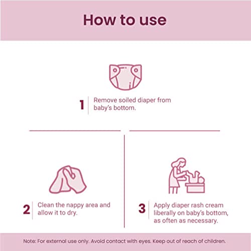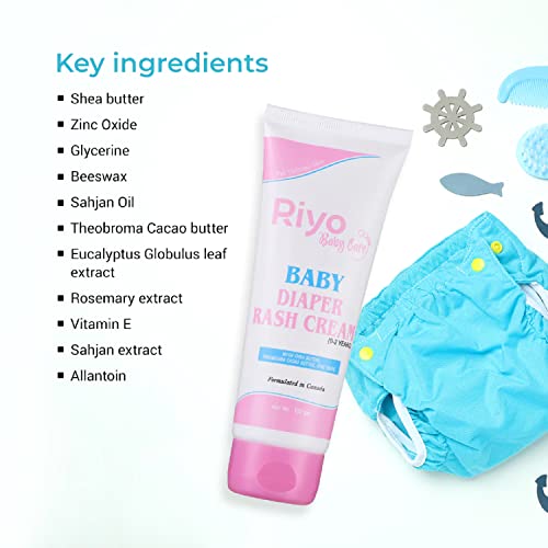 Riyo Baby Diaper Rash Cream is formulated with the goodness of Shea butter Vitamin E Theobroma Cacao Butter & Zinc Oxide that treats and prevents dry chapped itchy skin diaper rashes & minor skin irritations. It locks moisture and soothes the baby's delicate skin. The Diaper Rash Cream is best for baby's delicate skin & is especially formulated with natural extracts suitable for new born babies.Key ingredientsShea butter Zinc Oxide Glycerine Beeswax Sahjan Oil Theobroma Cacao butter Eucalyptus Globulus leaf extract Rosemary extract Vitamin E Sahjan extract Allantoin.Why Choose Riyo Baby Diaper Rash Cream ?* Provides complete protection against diaper rashes and heals the affected area in a few days.* A very mild formulation with Zinc Oxide that enhances protection against harmful rash / allergy causing germs / bacterias.* Suitable for newly born babies & extra sensitive skin types.* Absorbs quickly onto the skin leaving a non-sticky feel with effective hydration.* Proven effective in healing rashes redness and irritation due to diapers.* Free from formaldehyde/SLS that makes our cream allergic & irritants free.* Recommended for kids of age group 0 -2 years for soft healthy & rash free skin.How to use ?* After cleaning the baby's body with Riyo Baby Shower Gel / Bathing soap Take required amount of Riyo Baby Diaper Rash Cream on your palm.* Apply Riyo Baby Diaper Rash Cream generously onto the skin in contact with the diaper put on the diaper after a few minutes of applying the Diaper Rash Cream.* you can reapply after diaper change if required & can also be used on other rashes present on the baby's body.