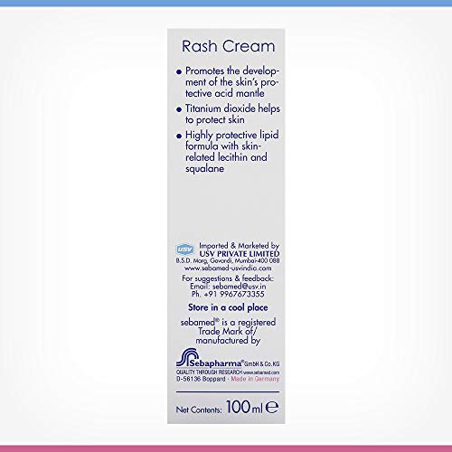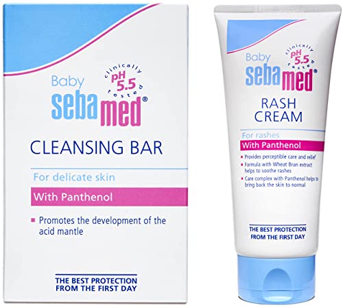Sebamed Baby Rash Cream 100mlSebamed rash cream contains micronized form of Titanium dioxide which forms physical barrier over skin. pH 5.5 + micronized form of Titanium dioxide ensures faster recovery as compared to conventional rash creams which contain zinc oxide and pH 7. The high panthenol content promotes skin regeneration and the healing of damaged skin. Natural bees wax + squalene + sorbitol ensures optimal hydration of baby's skin.Sebamed Baby Cleansing Bar (150g)Sebamed baby bar has ph of 5. 5 And sugar based mild cleanser. Other baby soaps have ph greater 7 which leads to barrier damage. When baby is born skin ph is 7. The acid mantle which protects the baby's delicate skin takes a few weeks to 3 months to develop the ph of skin then becomes 5. 5. At ph 5. 5 Alone the skin's protective barrier remains intact. It has been clinically proven that only at ph 5. 5