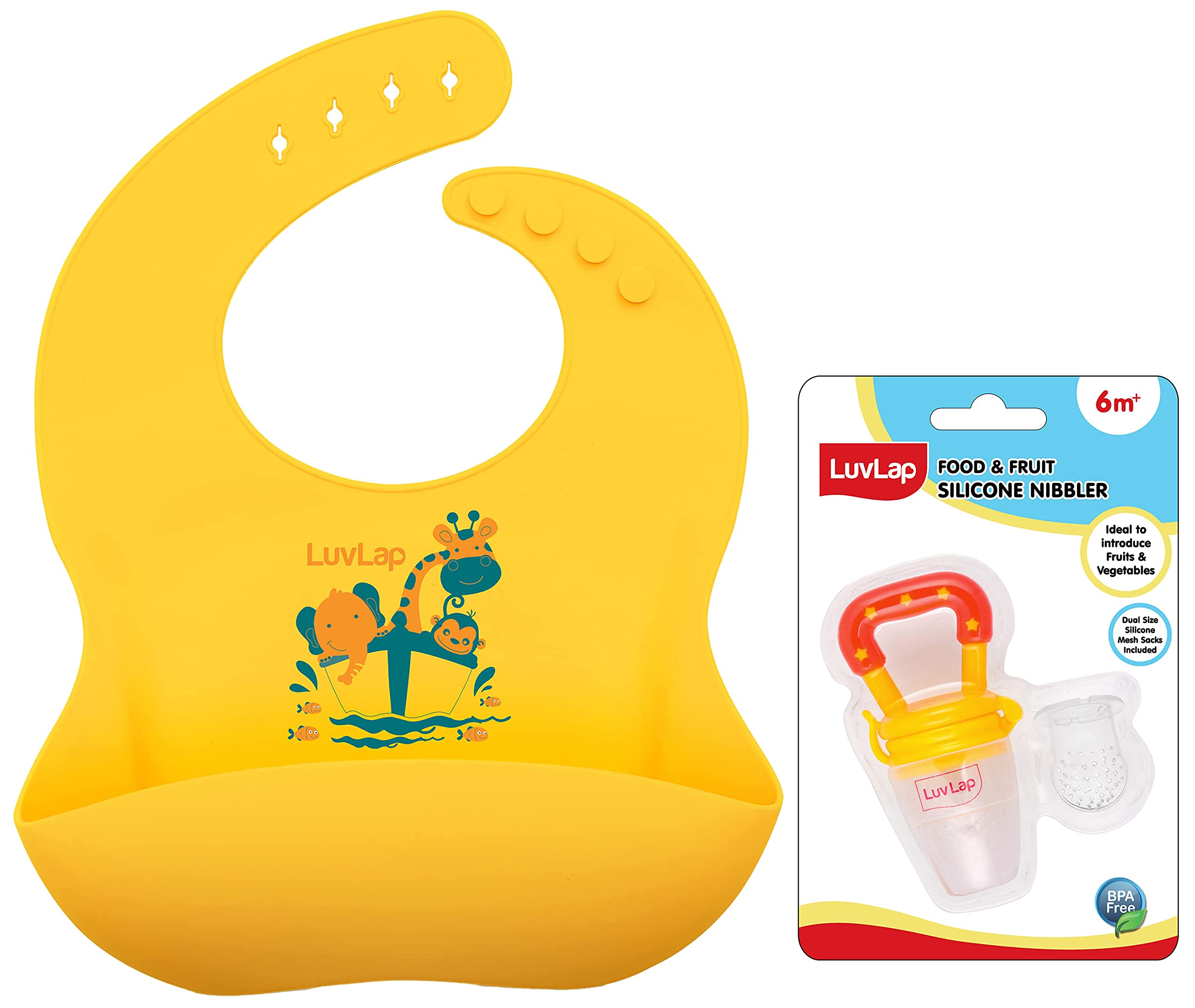 LuvLap Silicone Baby Bib for Feeding & Weaning Babies & Toddlers Waterproof Washable & Reusable Non Messy Easy Cleaning No Bad Odour Adjustable Neckline with Buttons (Yellow)LuvLap Silicone Baby Bib for Feeding & Weaning babies & Toddlers Waterproof (Yellow)LuvLap Silicone Food/Fruit Nibbler with Extra Mesh Soft Pacifier/Feeder Teether for Infant Baby Infant Joystar Yellow BPA FreeFruit nibbler and teething toy to provide gentle relief to gums. Serves dual purpose of feeding fruit and vegetables to babies and can also be used as a teether. Can be filled with chilled fruits/vegetables to provide added relief. Made with bpa free food grade plastic and soft silicone it comes in attractive handle designs to EN gage the baby and is easy to hold and nibble upon.