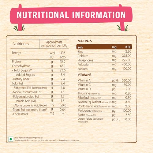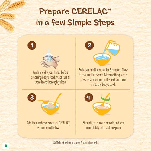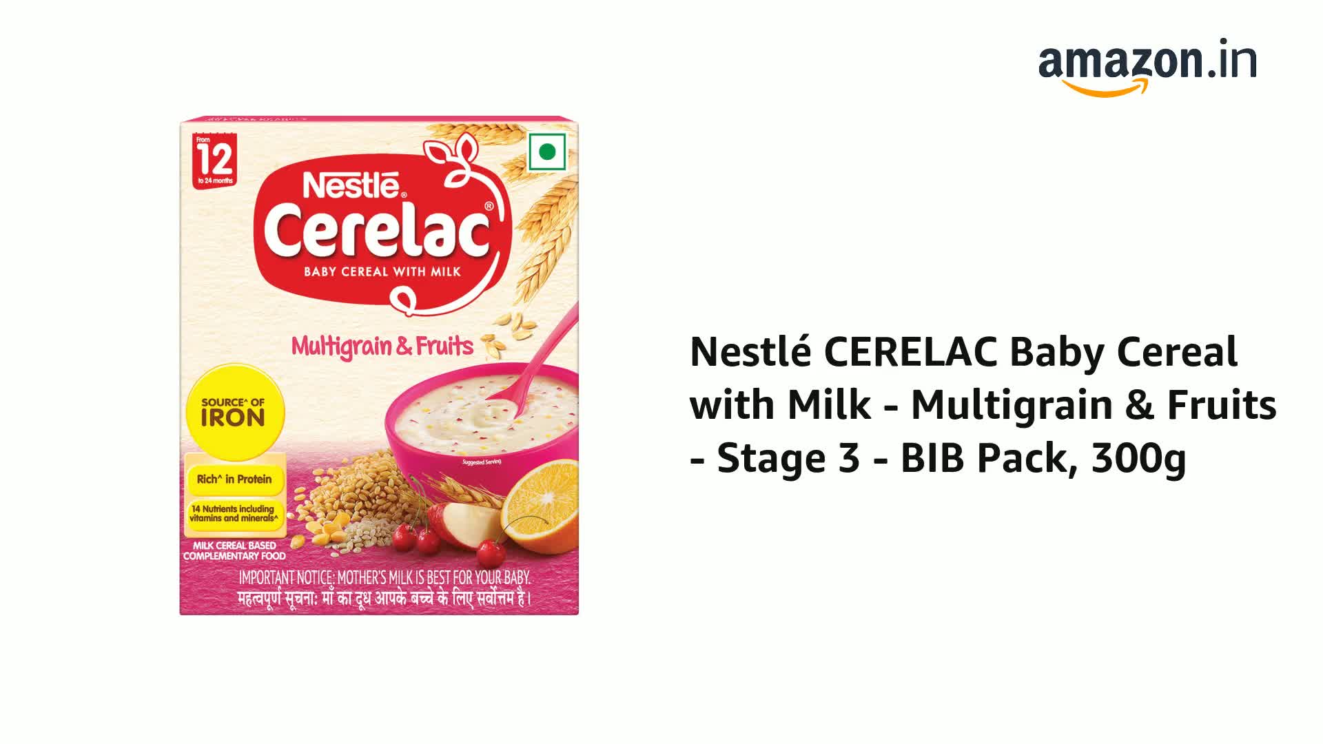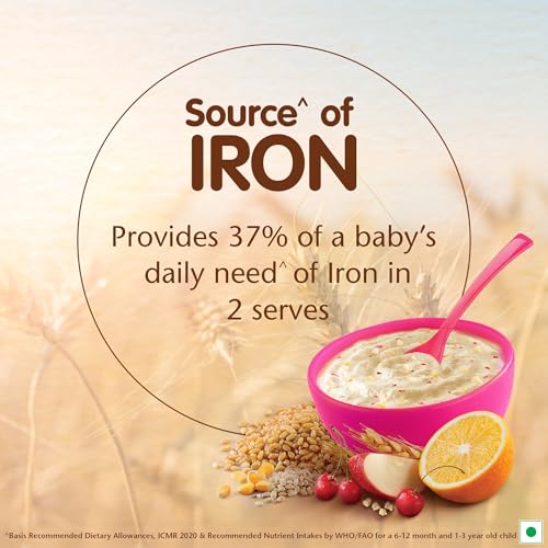 Product Description Nestle Cerelac Baby Cereal with Milk is a complementary baby food for infants from 12 to 24 months. While infants and children have higher requirements of nutrients than adults 2 serves of Cerelac Multigrain & Fruits Cereal provide 37% of a babyâs daily need^ of iron. It is also a source of 14 important nutrients including vitamins and minerals. Vitamin A C D and Zinc help support normal immune system function. This baby cereal is rich in protein and packed with the goodness of cereal milk and fruits. With 155 years of scientific expertise in infant nutrition Nestle develops infant nutrition products backed by evolving science and research. Innovation has been at the heart of Nestle since its beginning. Storage Instructions: After opening the pack the contents should immediately be transferred to an empty clean dry and airtight container. After each use replace lid tightly & store in a cool & dry place. Important Notice: Motherâs milk is best for your baby. ^Basic Recommended Dietary Allowance ICMR 2020 & Recommended Nutrient Intake by WHO/FAO for a 1-3 year old child.Safety Warnings: Infant food should be used only on the advice of a health worker as to the need for its use and the proper method of its use. Infant food is not the sole source of nourishment for an infant. Use prepared feed within half an hour otherwise microbial deterioration may set in. Discard unused feed. From the Manufacturer IngredientsMilk solids Wheat flour Sucrose Orange juice concentrate Malted barley flour Soyabean oil Apple Rice Corn Apricot crunchies Cherry crunchies Strawberry crunchies Minerals and VitaminsStorage InstructionsAfter opening this pack the content should immediately be transferred to an empty clean dry & airtight container. After each use replace lid tightly & store in a cool & dry place. Directions Wash your hands. Use clean utensils Boil drinking water for 5 minutes. Leave it till lukewarm Pour 95 ml of lukewarm water into a bowl Add 4 level scoops of CERELAC Stir until pap is smooth. Feed your baby with a clean spoonSafety WarningsCareful and hygienic preparation of infant food is most essential for health. Do not use fewer scoops than directed since diluted feeding will not provide adequate nutrition needed by your infant. Do not use more scoops than directed since concentrated feed will not provide the water needed by your infant. Infant food should be used only on the advice of a health worker as to the need for its use and the proper method of its use. The world health organization recommends exclusive breastfeeding for 6 months. Nestle supports this recommendation. Since babies vary in their needs consult your healthcare professional for advice on when to introduce CERELAC to your child. Breastfeeding should continue for as long as possible after introduction of weaning foods. Indications/Suggested UsageComplementary food for babies after 6 months when breast milk alone can no longer totally cover the baby's growing nutritional requirements
