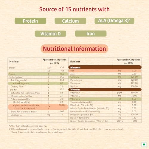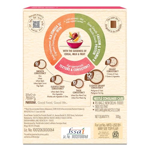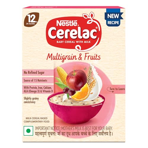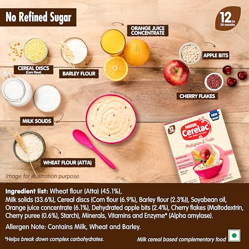 Nestle CERELAC Multigrain & Fruits with No Refined Sugar is a complementary baby food for infants from 12 to 24 months. It is also a source of 15 important nutrients including vitamins and minerals. With Iron Protein Calcium ALA (Omega 3) & Vitamin D. This baby food cereal is packed with the goodness of cereal milk and fruit. With 155 years of scientific expertise in infant nutrition Nestle develops infant nutrition products backed by evolving science and research. Innovation has been at the heart of Nestle since its beginning. Contains no Refined Sugar. Storage Instructions: Store unopened pack in a cool and dry place.After opening use the contents within 3 weeks or the expiry date whichever is earlier. Prolonged storage and exposure to air may result in infestation & off odors & taste. On opening transfer the contents of the pack along with the pouch into a clean airtight container. After each use close lid tightly and store in a cool dry and hygienic place. Important Notice: Motherâs milk is best for your baby. Warning/Caution : Careful and hygienic preparation of infant food is most essential for health. Do not use fewer scoops than directed since diluted feeding will not provide adequate nutrients needed by your infant. Do not use more scoops than directed since concentrated feed will not provide the water needed by your infant. Infant food shall be only used on the advice of a health worker as to the need for its use and the proper method of its use Safety warning: Infant food is not the sole source of nourishment of an infant. Boiled and cooled water shall be used to prepare this product and any leftover product must be discarded to reduce the risk of infection Use prepared feed within half an hour otherwise microbial deterioration may set in. Discard unused feed. The scoop provided with this pack should be thoroughly washed and dried before use Allergen note: Contains Wheat and Milk. May contain Barley.