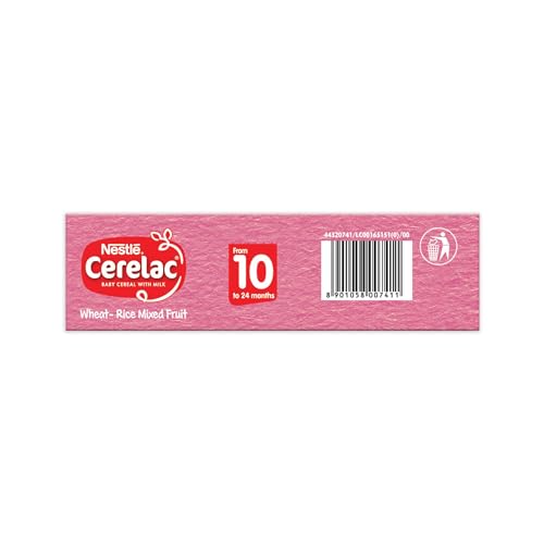 Nestle CERELAC Wheat Rice Mixed Fruit is a complementary baby food for infants from 10 to 24 months. 2 serves of CERELAC Wheat Rice Mixed Fruit Cereal provide 37% of a babyâs daily need^ of iron. It is also a source of 14 important nutrients including vitamins and minerals. This baby food cereal is rich in protein and packed with the goodness of cereal milk and fruits. With 155 years of scientific expertise in infant nutrition Nestle develops infant nutrition products backed by evolving science and research. Innovation has been at the heart of Nestle since its beginning. Storage Instructions: After opening the pack the contents should immediately be transferred to an empty clean dry and airtight container. After each use replace lid tightly & store in a cool dry and hygenic place. Important Notice: Motherâs milk is best for your baby. ^Basic Recommended Dietary Allowance ICMR 2020 & Recommended Nutrient Intake by WHO/FAO for a 6-12 month and 1-3 year old child.Safety Warnings: Infant food should be used only on the advice of a health worker as to the need for its use and the proper method of its use. Infant food is not the sole source of nourishment for an infant. Use prepared feed within half an hour otherwise microbial deterioration may set in. Discard unused feed.