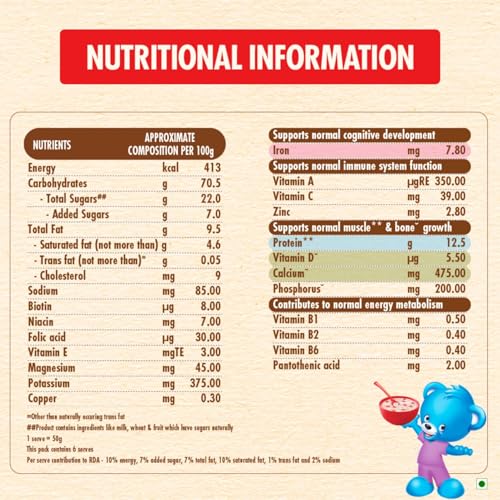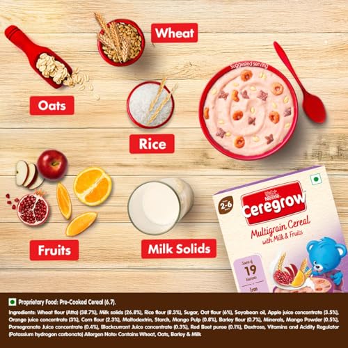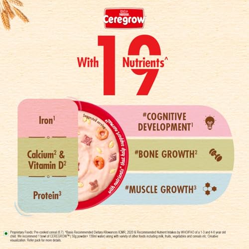 Ceregrow Growing Up Cereal is a nutritious cereal with the goodness of multigrain milk & fruits designed to meet the nutritional needs of your child. It's packed with nourishment and benefits of 16 vitamins & minerals to help support the normal physical growth & development of the child. These cereals for kids is a rich source of Iron that helps in normal cognitive development. Crafted for your li'l one it has immuno-nutrients like Vitamin A C D Iron & Zinc which help support normal immune system function.