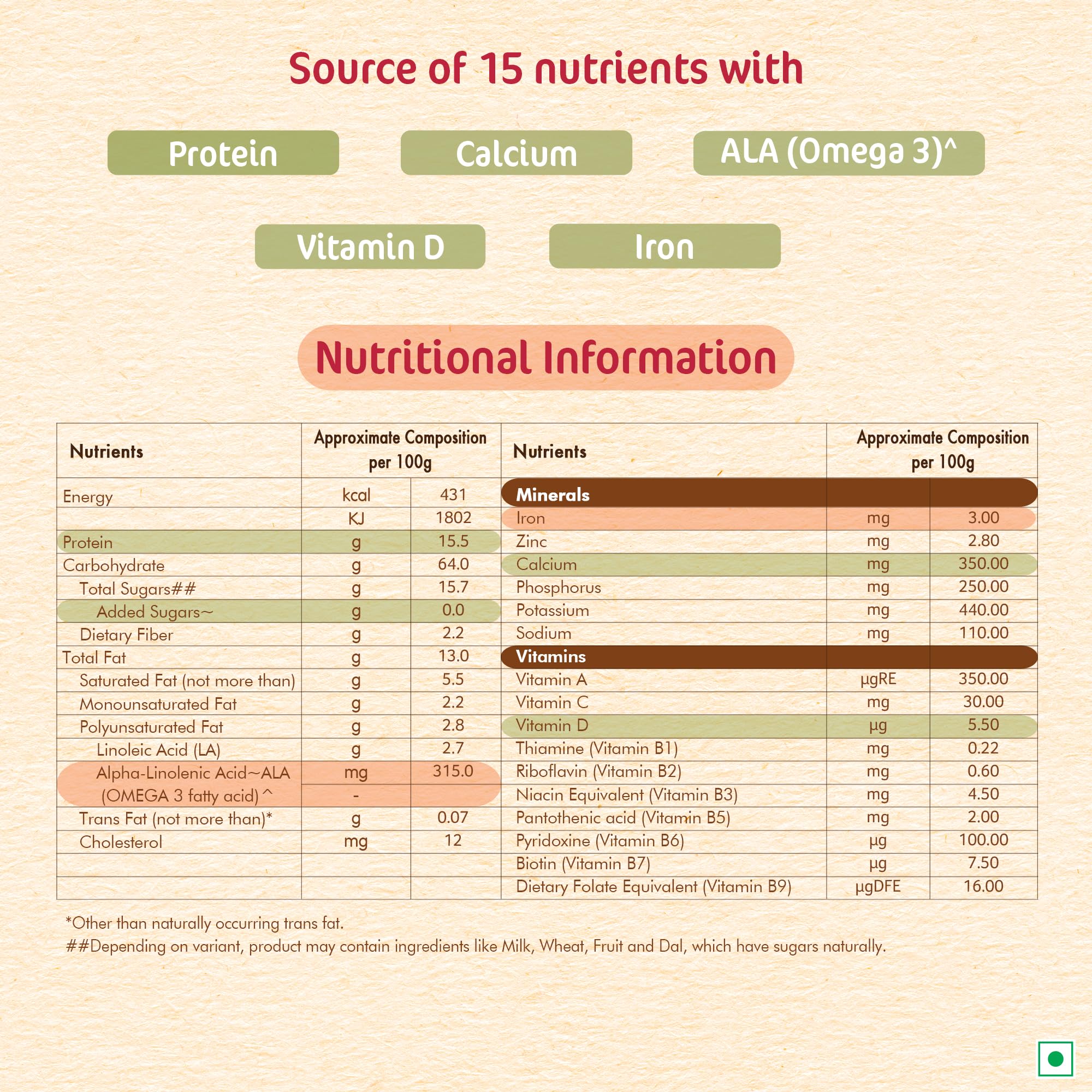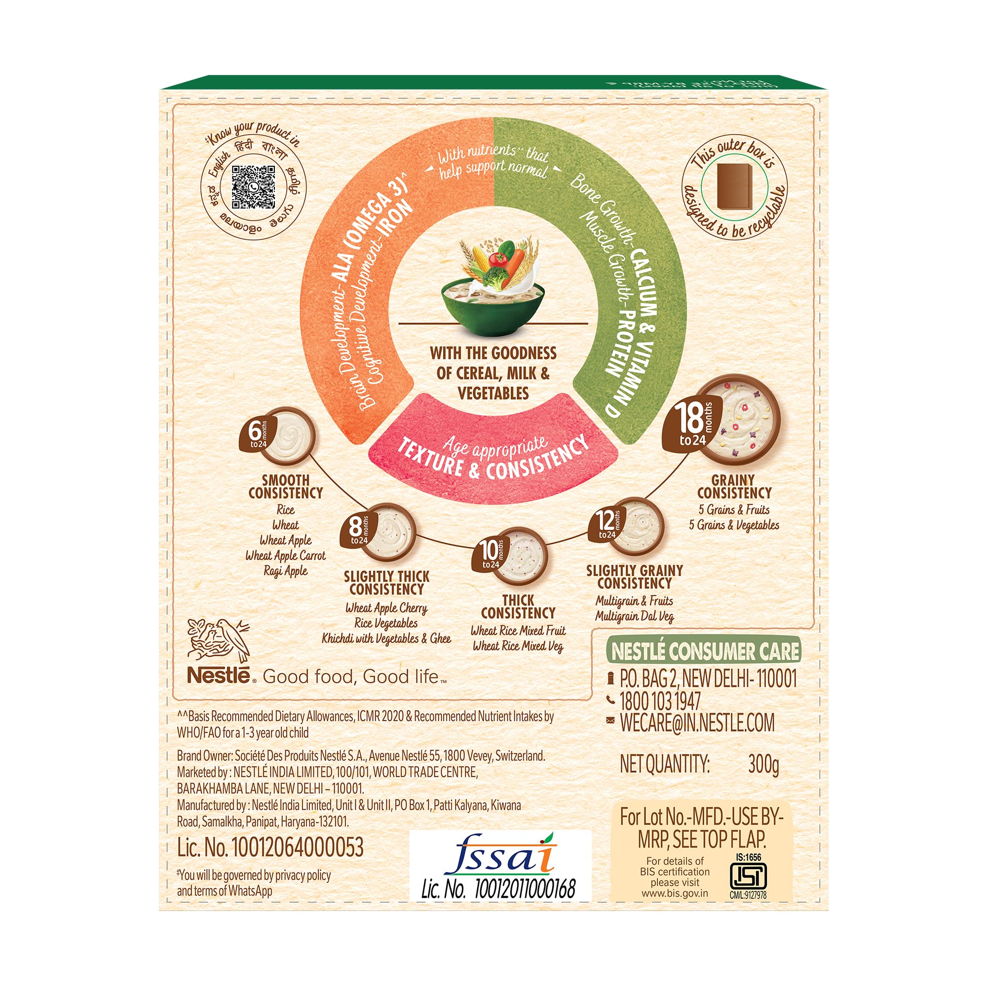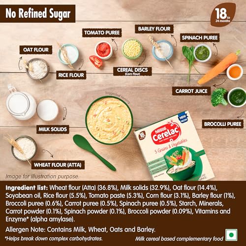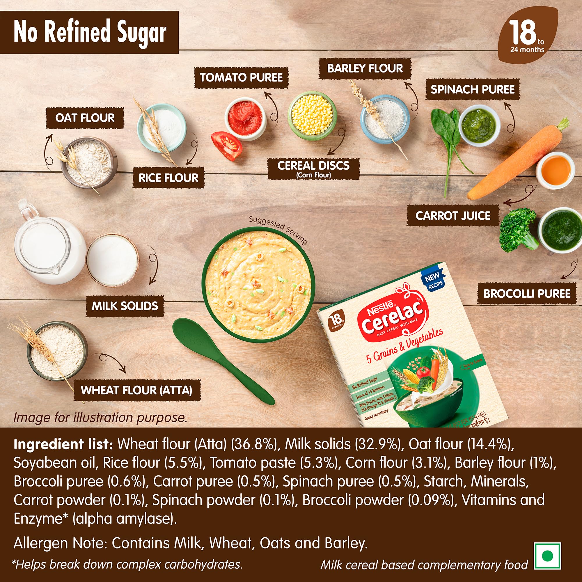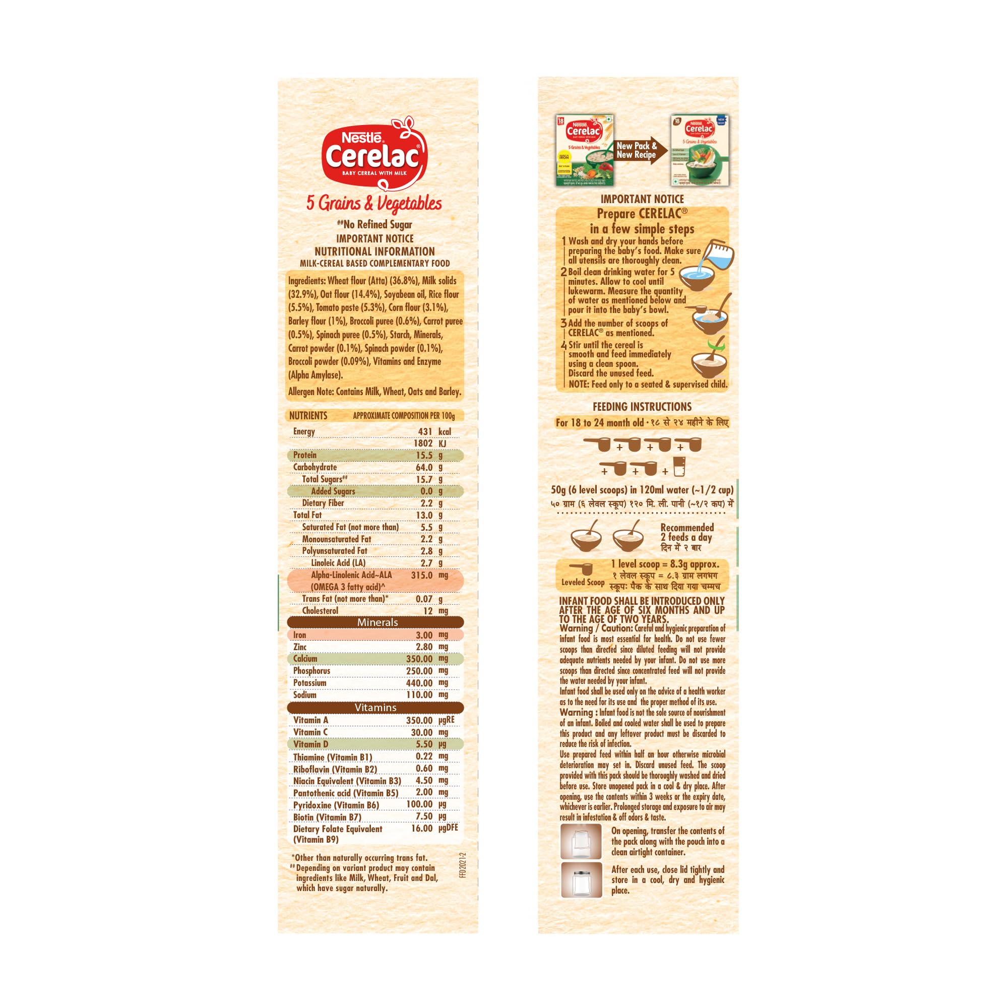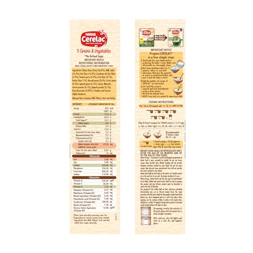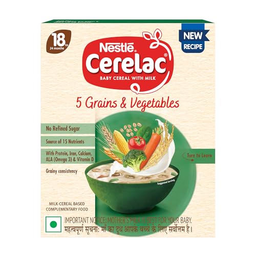 Nestle Cerelac Baby Cereal with Milk is a complementary baby food for infants from 18 to 24 months. While infants and children have higher requirements of nutrients than adults 2 serves of Cerelac 5 Grains & Vegetables Cereal provide 37% of a babydaily needof iron. It is also a source of 14 important nutrients including vitamins and minerals. Vitamin A C D and Zinc help support normal immune system function. This baby cereal is rich in protein and packed with the goodness of cereal milk and vegetables. With 155 years of scientific expertise in infant nutrition Nestle develops infant nutrition products backed by evolving science and research. Innovation has been at the heart of Nestle since its beginning. Usage: Step 1: Wash and dry your hands before preparing baby's food. Make sure all utensils are throughly clean. Step 2: Boil clean drinking water for 5 minutes. Allow to cool until lukewarm. Measure the quantity of water as mentioned on the table-1 above and pour it into the babybowl. Step 3: Add the number of scoops of CERELAC as mentioned in the table 1. Step 4: Stir until the cereal is smooth and feed immediately using a clean spoon. Warning: Infant food should be used only on advice of a health worker as to the need for its use. Discard unused feed. Infant food is not the sole source of nourishment. Storage Instructions - After opening the pack the contents should immediately be transferred to an empty clean dry and airtight container. After each use replace lid tightly & store in a cool dry and hygenic place.